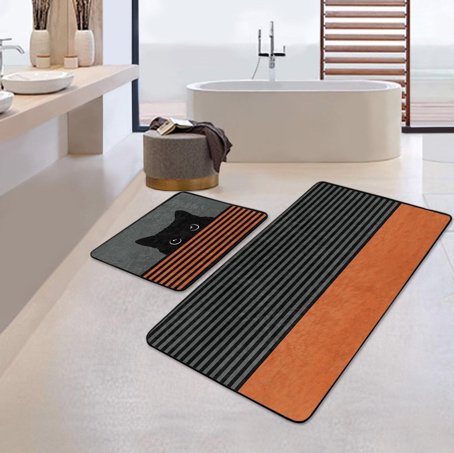 Turuncu Çizgili Kedi Motifli 2li Banyo Paspas ve Halısı Takımı Kaymaz Taban Yıkanabilir
