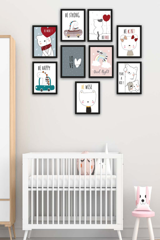 Orijinal World of Walls 9 Parça Çocuk Odası Sevimli Kedi Siyah Çerçeve Görünümlü Uv Baskı Mdf Ahşap Duvar Tablo Seti Materyal: %100 mdf ürün 9 parç...