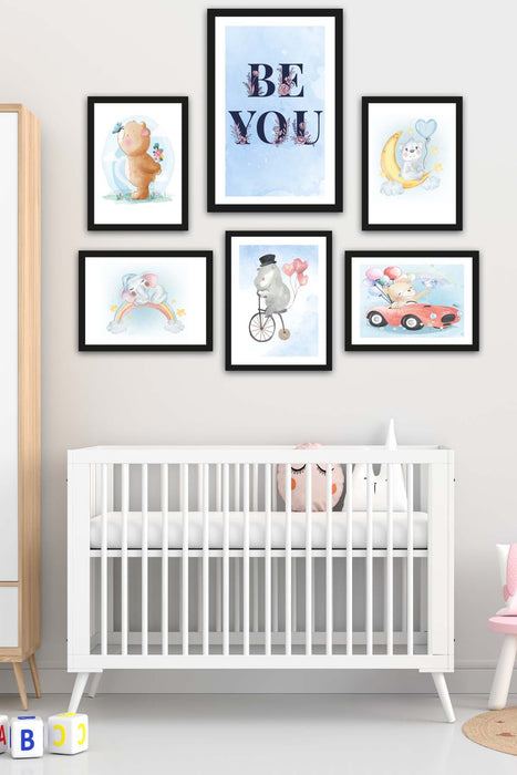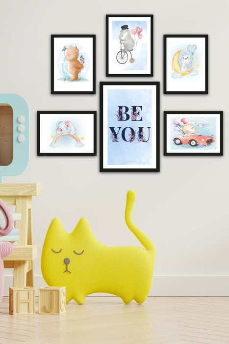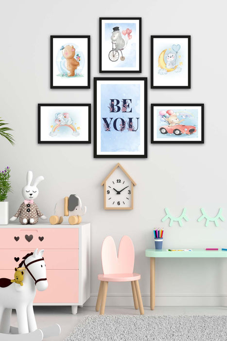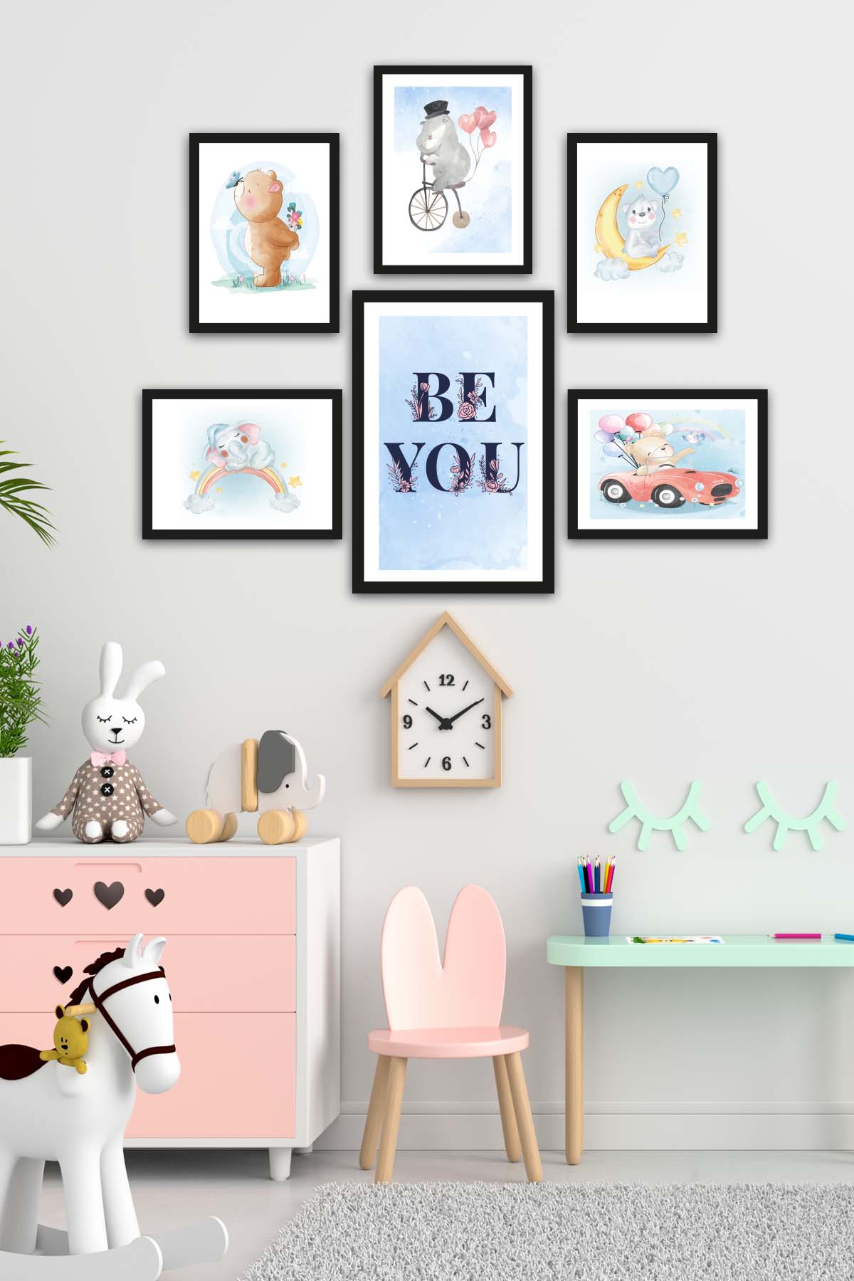 Orijinal World of Walls 6 Parça Çocuk Odası Suluboya Tarzında Siyah Çerçeve Görünümlü Uv Baskı Mdf Ahşap Duvar Tablo Seti