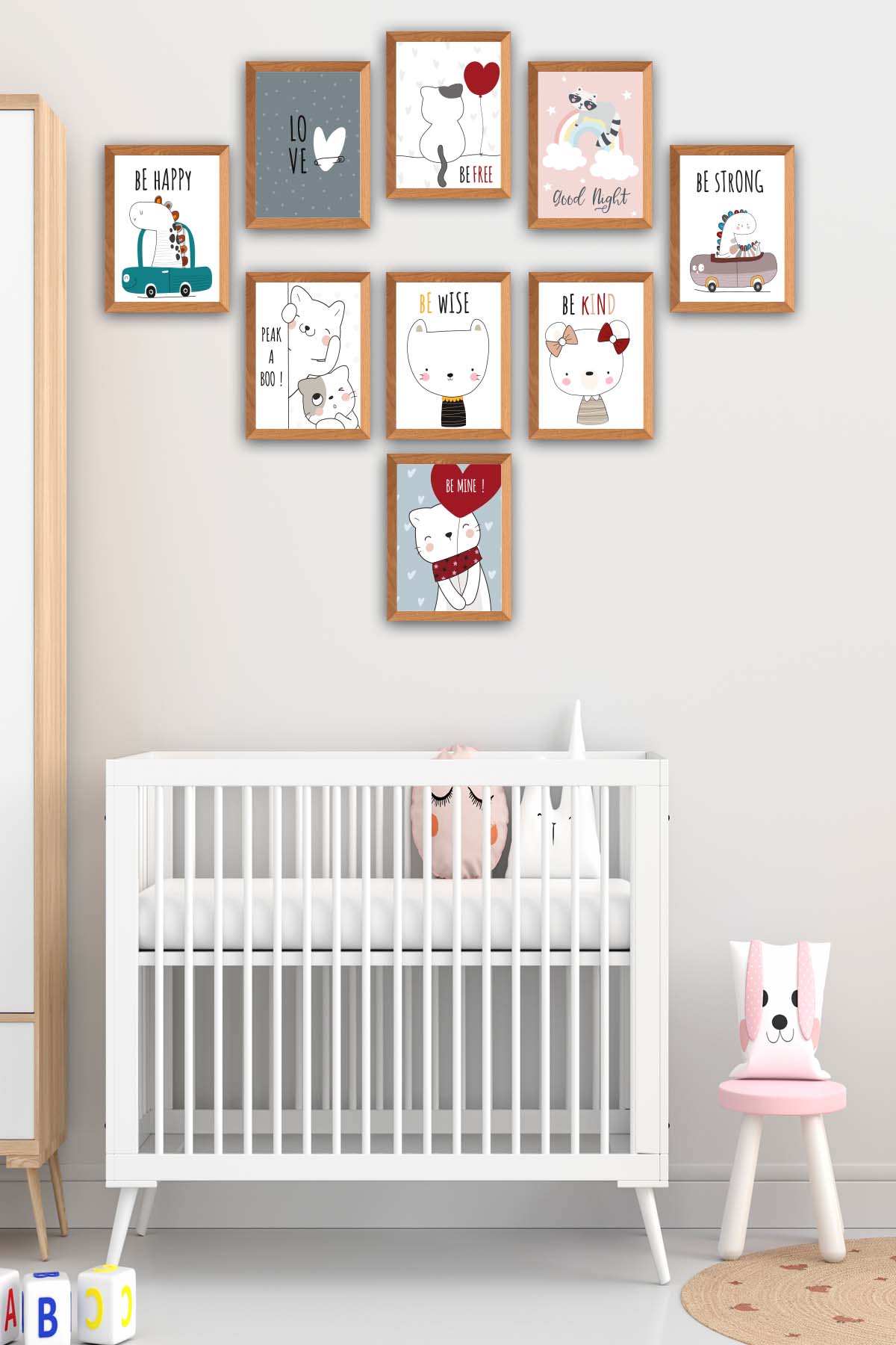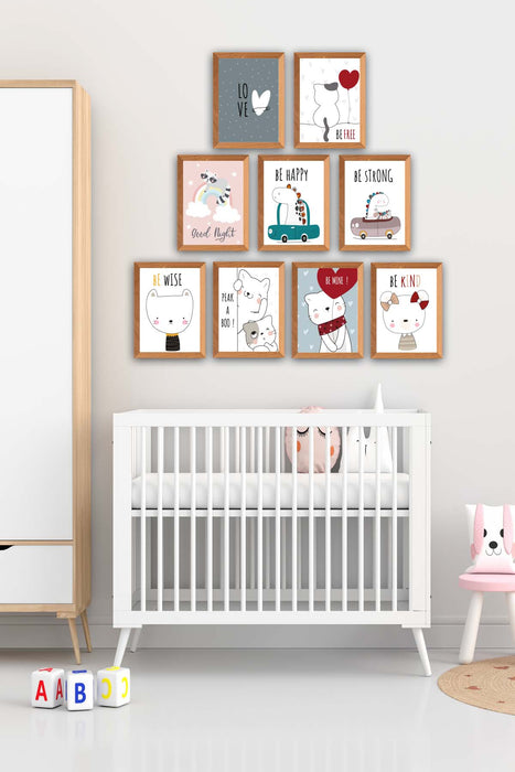 Orijinal World of Walls 9 Parça Çocuk Odası Sevimli Kedi Çerçeve Görünümlü Uv Baskı Mdf Ahşap Duvar Tablo Seti
