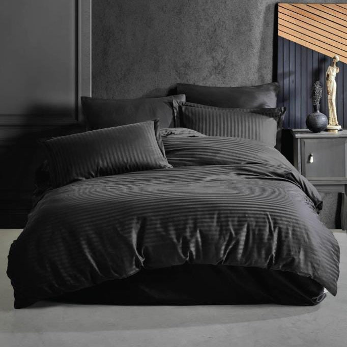 Çizgili Siyah Saten Çift Kişilik Nevresim Takımı 84 Tel 4 Adet Yastık