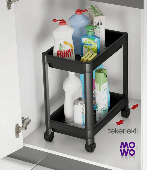 2 Katlı Evye Tekerlekli Düzenleyici Raf Siyah 2 Katlı Tekerlekli Raf Ünitesi, Banyo dolabı düzenlemede, Mutfak tezgah altı ve Evye altı düzenlemede...