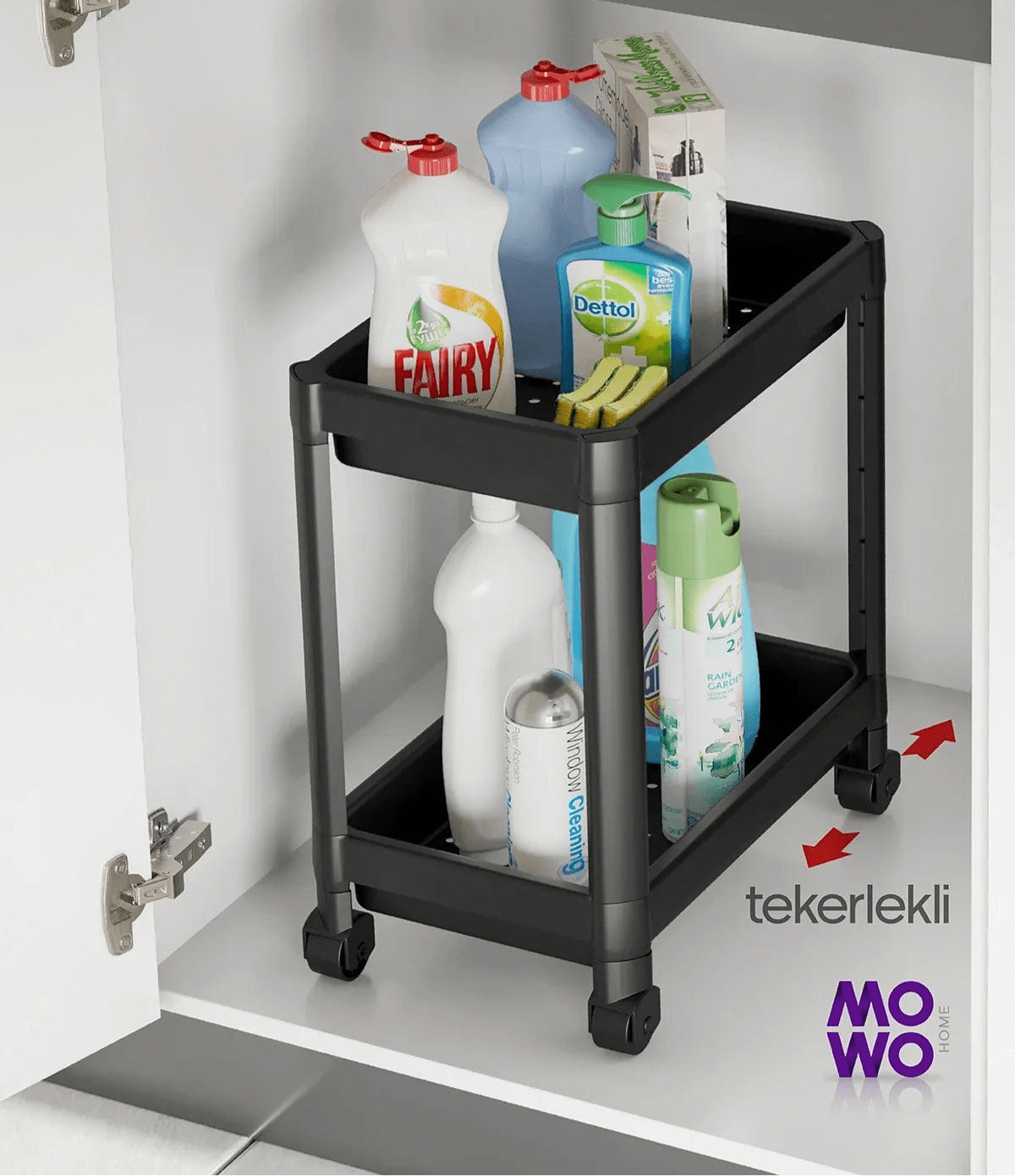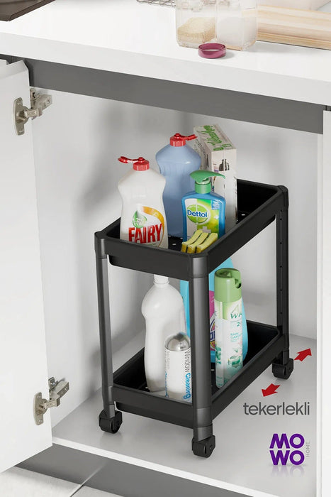 2 Katlı Evye Tekerlekli Düzenleyici Raf Siyah