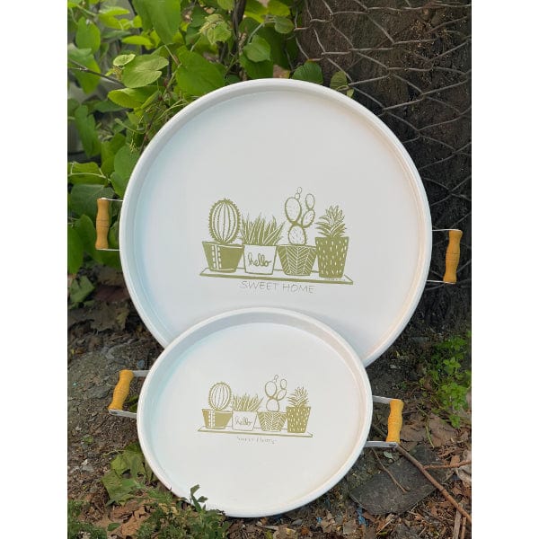 Büyük boy tepsinin çapı 51 cm, küçük boy tepsinin çapı ise 37 cm'dir. Bu şık ikili tepsi seti, yuvarlak formu ve estetik tasarımıyla mükemmel bir sunum aracıdır. Ahşap tutma kulpları sayesinde rahatlıkla taşınabilir. Hem işlevsel hem de dekoratif olarak kullanılabilir. Evde misafir ağırlarken, kahve saati sunumları veya yemek servisleri için ideal bir seçenektir. Modern tarzı ve pratikliğiyle her evde yerini alacak.