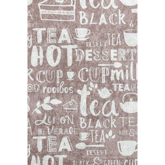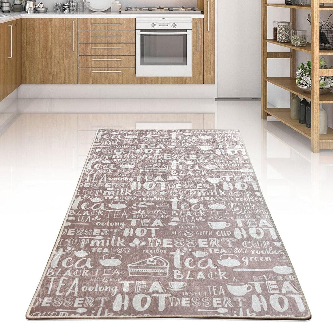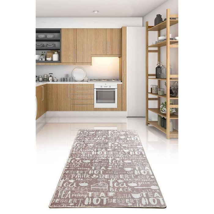 Hot Tea Bej Dijital Baskılı Mutfak Halısı, Kaymaz Taban, Yıkanabilir