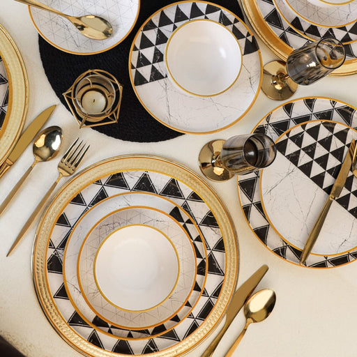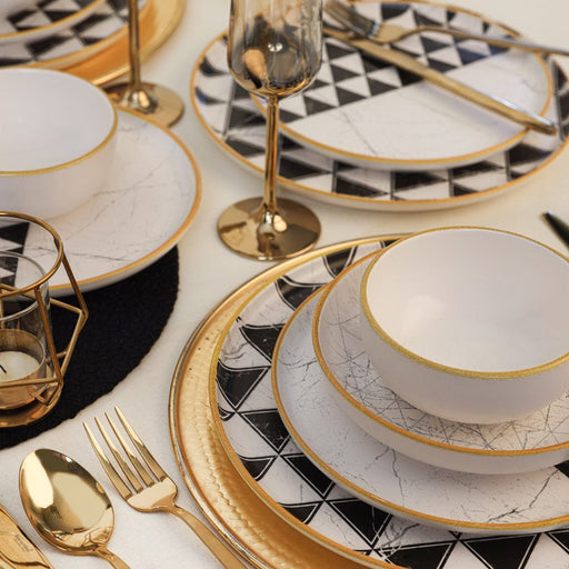 Trigon Yemek Takımı 24 Parça 6 Kişilik Nordic formunun Üçgen çizgilerin mermer dekoruyla buluştuğu Trigon Yemek takımı şık sunumlar için özenle tas...