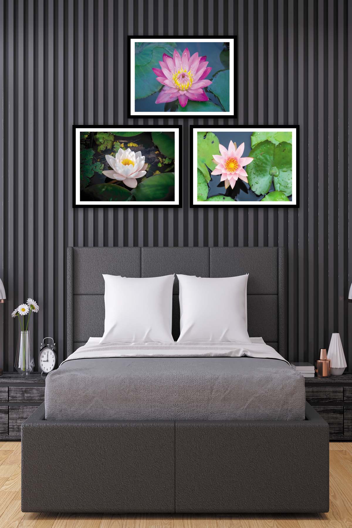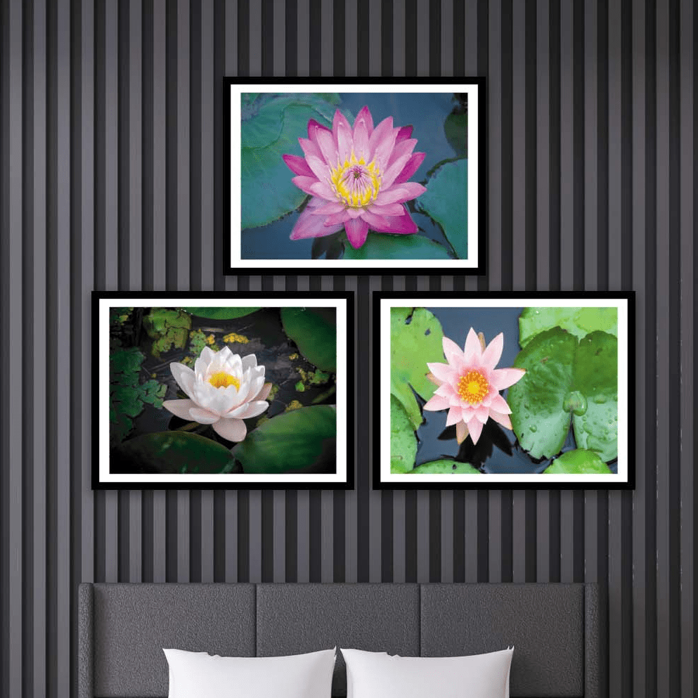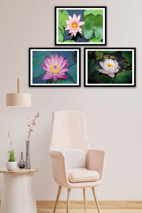 Orijinal World of Walls 3 Parça Gölde Yüzen Pembe Çiçek Tarzında Siyah Çerçeve Görünümlü Mdf Ahşap Duvar Tablo Seti