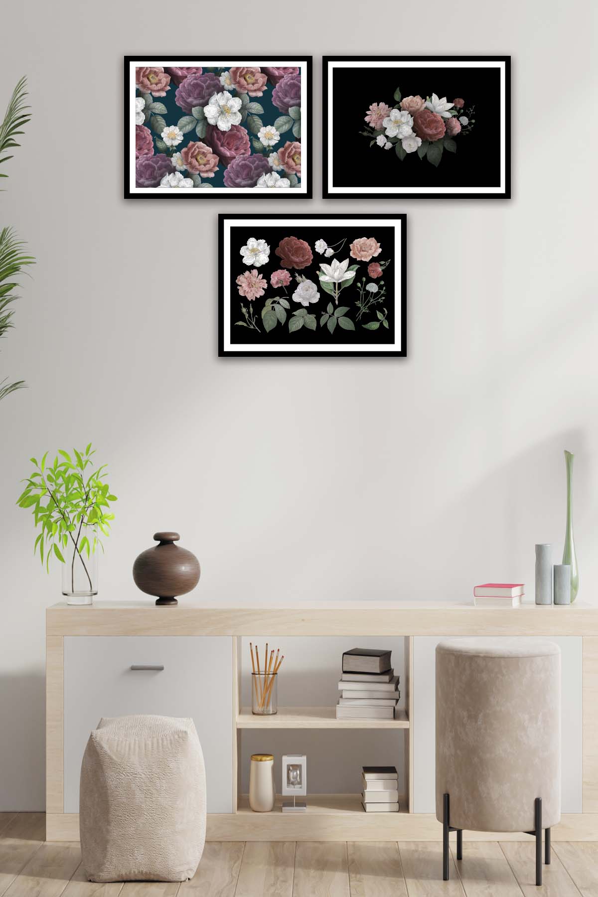 Orijinal World of Walls 3 Parça Gül ve Çiçek Tarzında Siyah Çerçeve Görünümlü Mdf Ahşap Duvar Tablo Seti