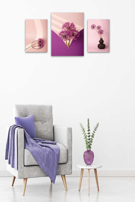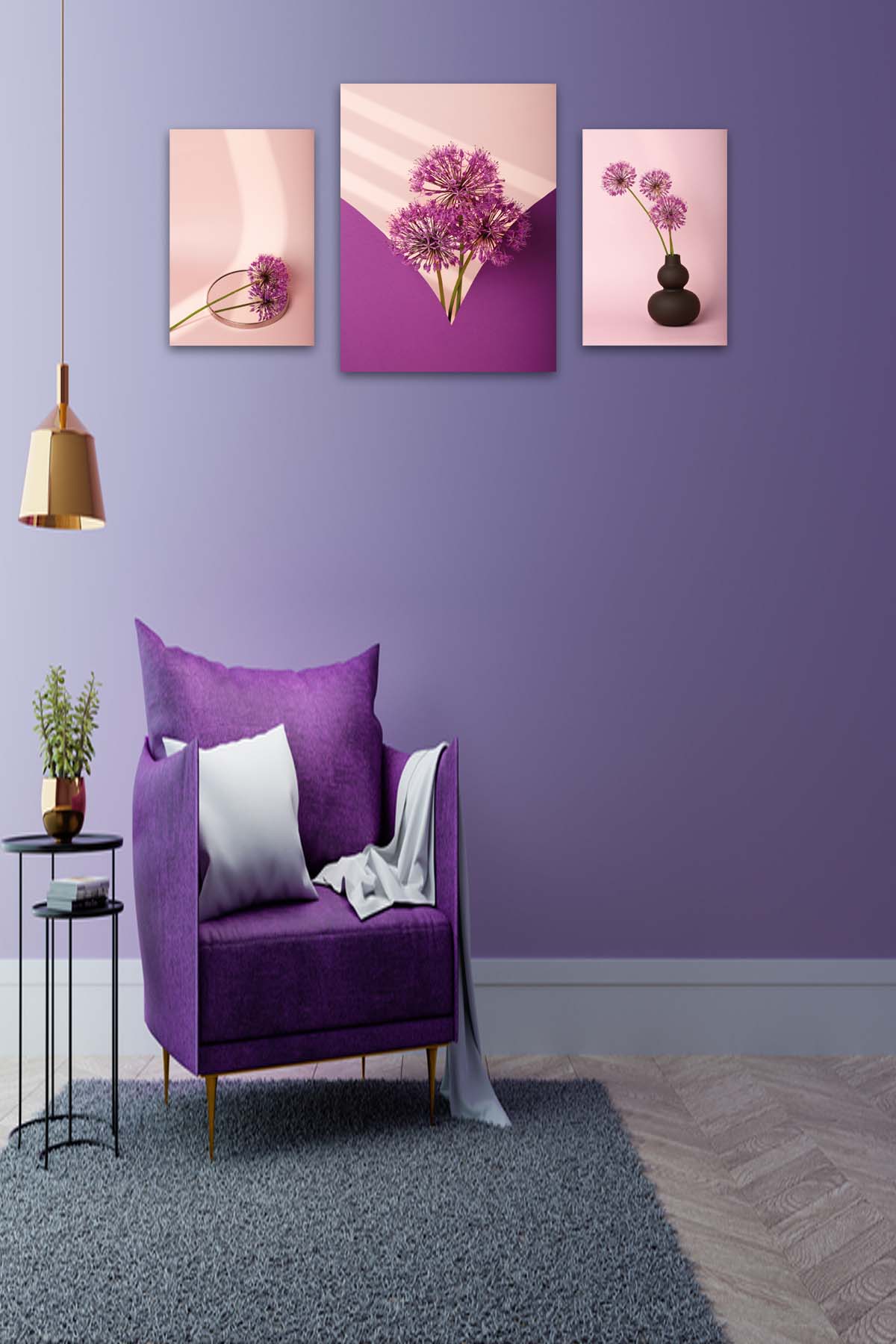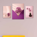Orijinal World of Walls 3 Parça Mor Çiçek Desenli Uv Baskı Ahşap Duvar Tablo Seti