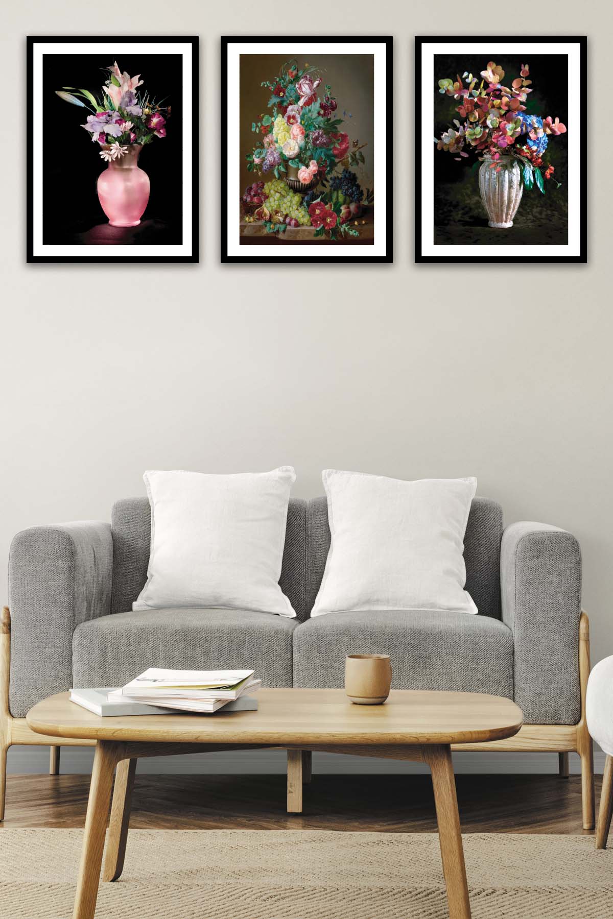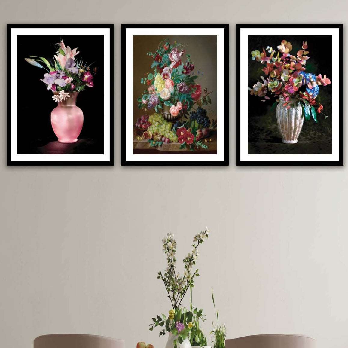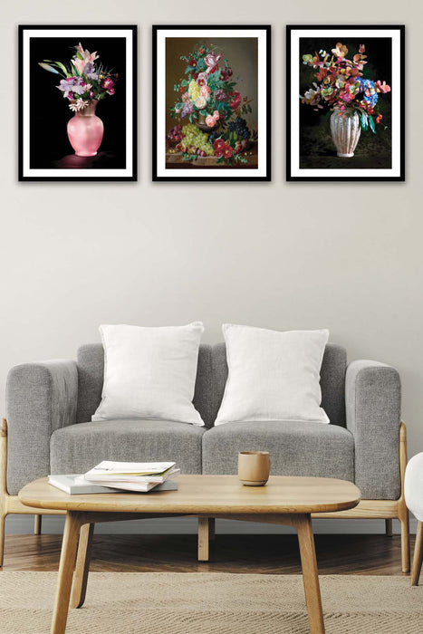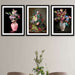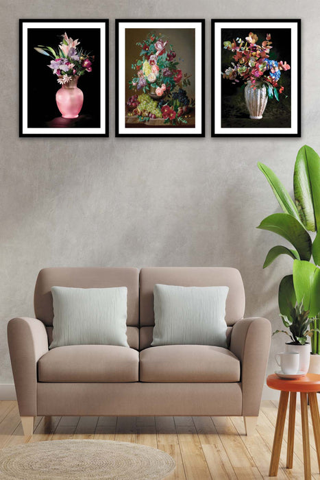 Orijinal World of Walls 3 Parça Pastel Boya Çiçek Desenli Siyah Çerçeve Görünümlü Mdf Ahşap Duvar Tablo Seti