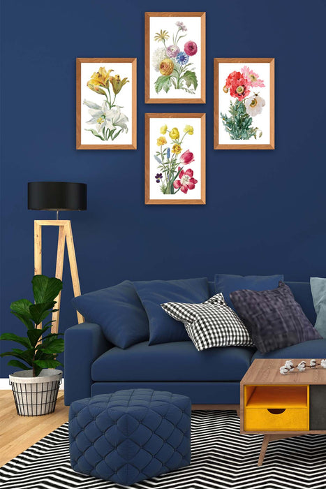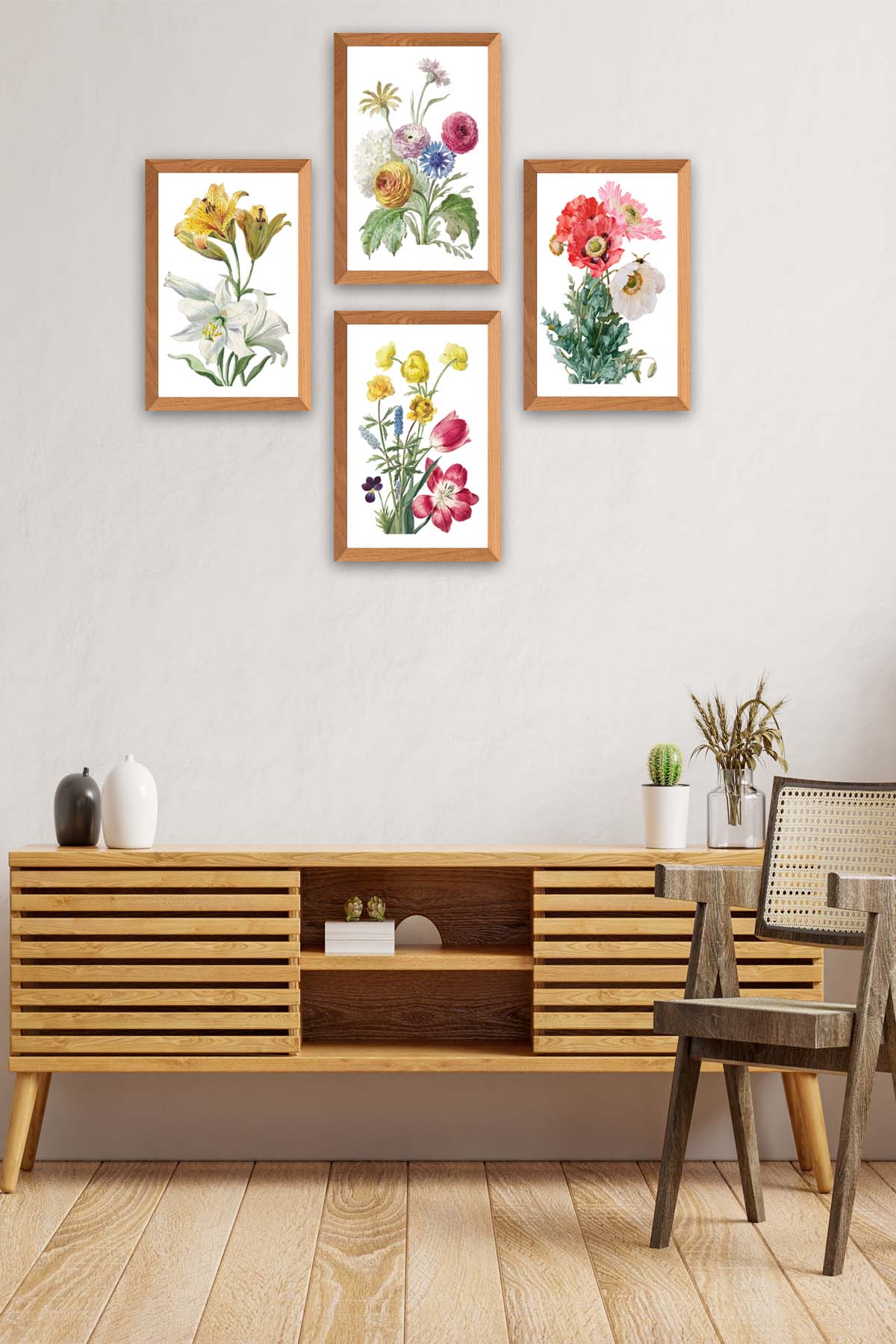 Orijinal World of Walls 4 Parça Suluboya Tarzında Çiçek Desenli Çerçeve Görünümlü Uv Baskı Mdf Ahşap Duvar Tablo Seti