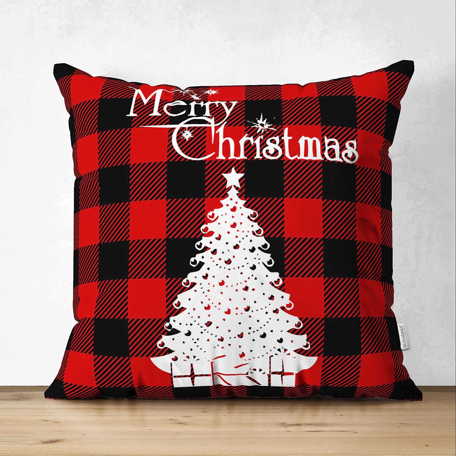 Çift Taraflı Siyah Kırmızı Ekose Desenli Yılbaşı Temalı Dekoratif Süet Yastık Kırlent Kılıfı