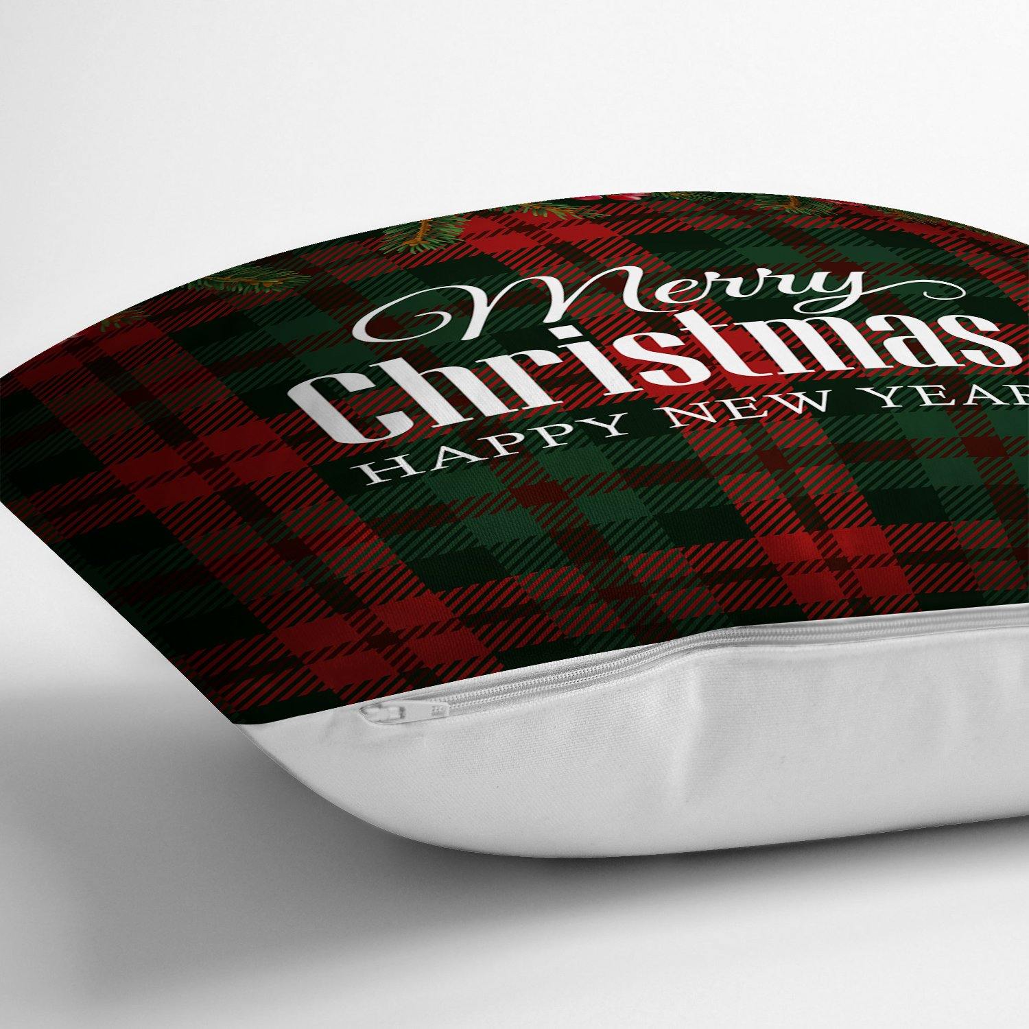Ekose Zeminde Merry Christmas Yılbaşı Baskılı Dekoratif Yastık Kırlent Kılıfı 43x43cm