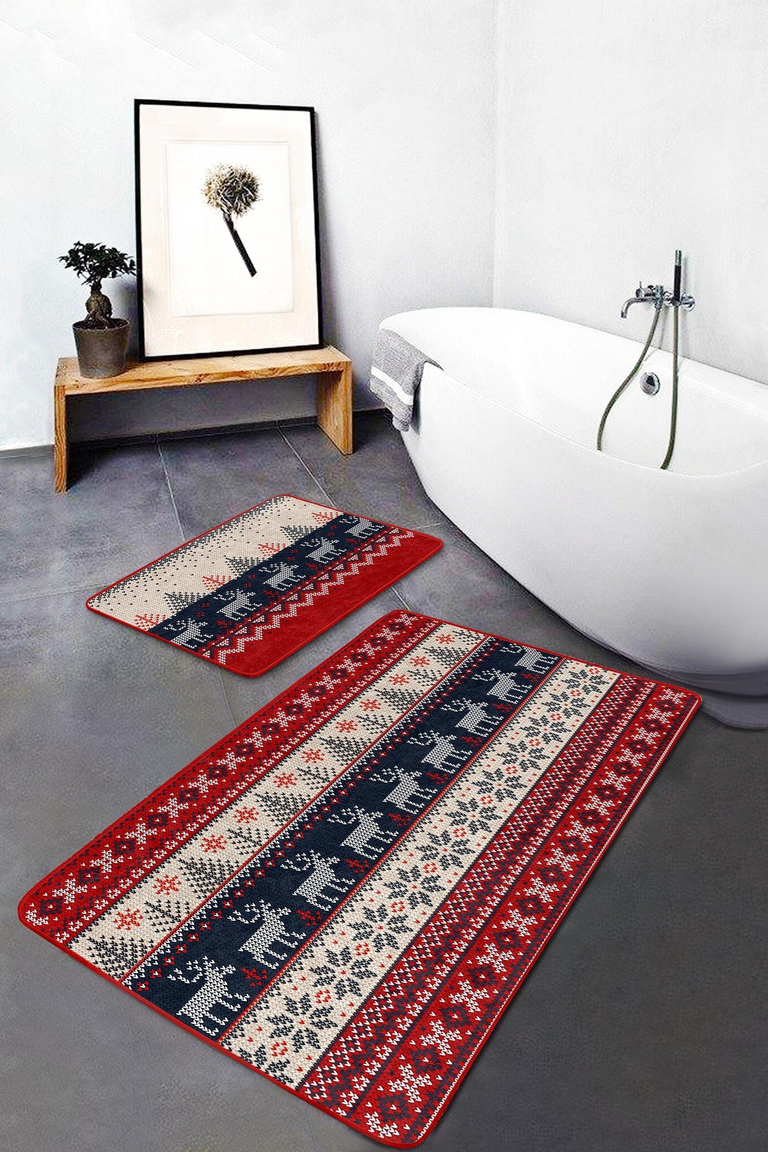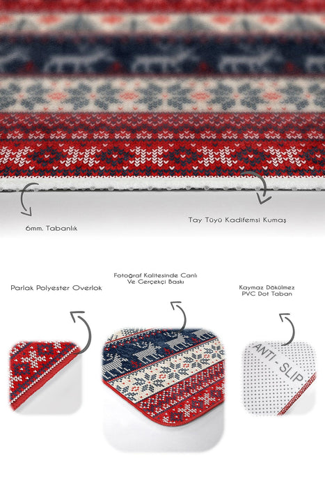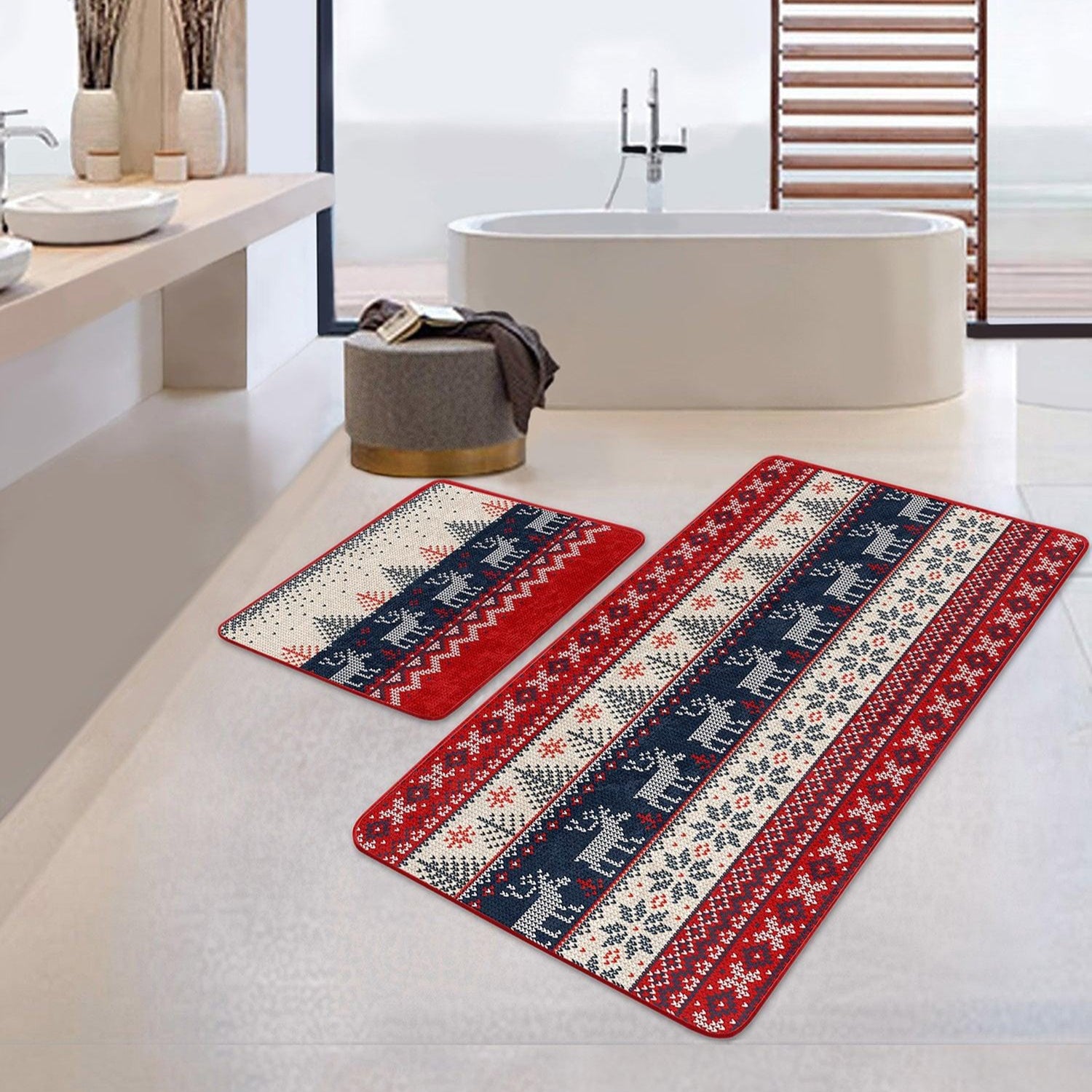 Kanaviçe Tasarımlı Yılbaşı Temalı Dijital Baskılı 2li Halı Takımı Kaymaz Taban Yıkanabilir