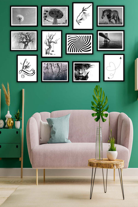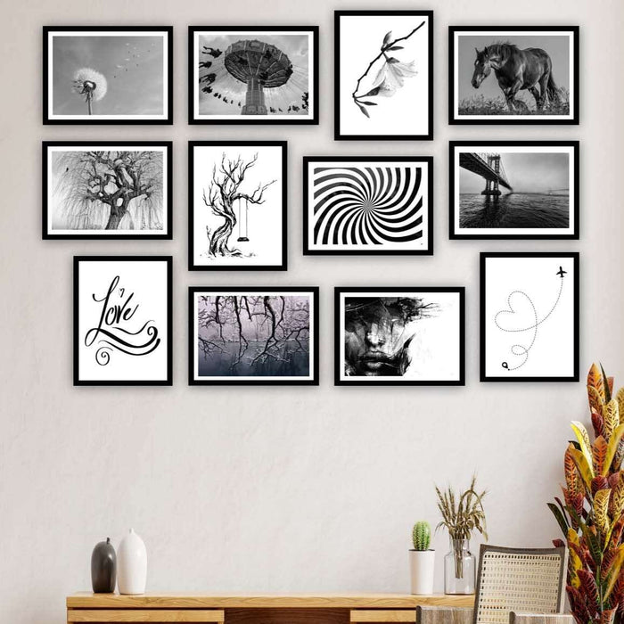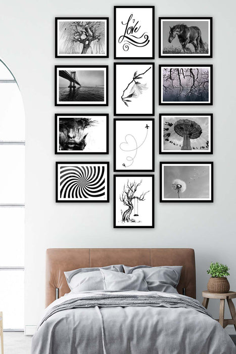 Orijinal World of Walls 12 Parça Siyah Beyaz Sanatsal Çerçeve Görünümlü Duvar Tablo Seti