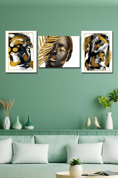 Orijinal World of Walls 3 Parça Altın Görünümlü Afrikalı Kadın Duvar Tablo Seti