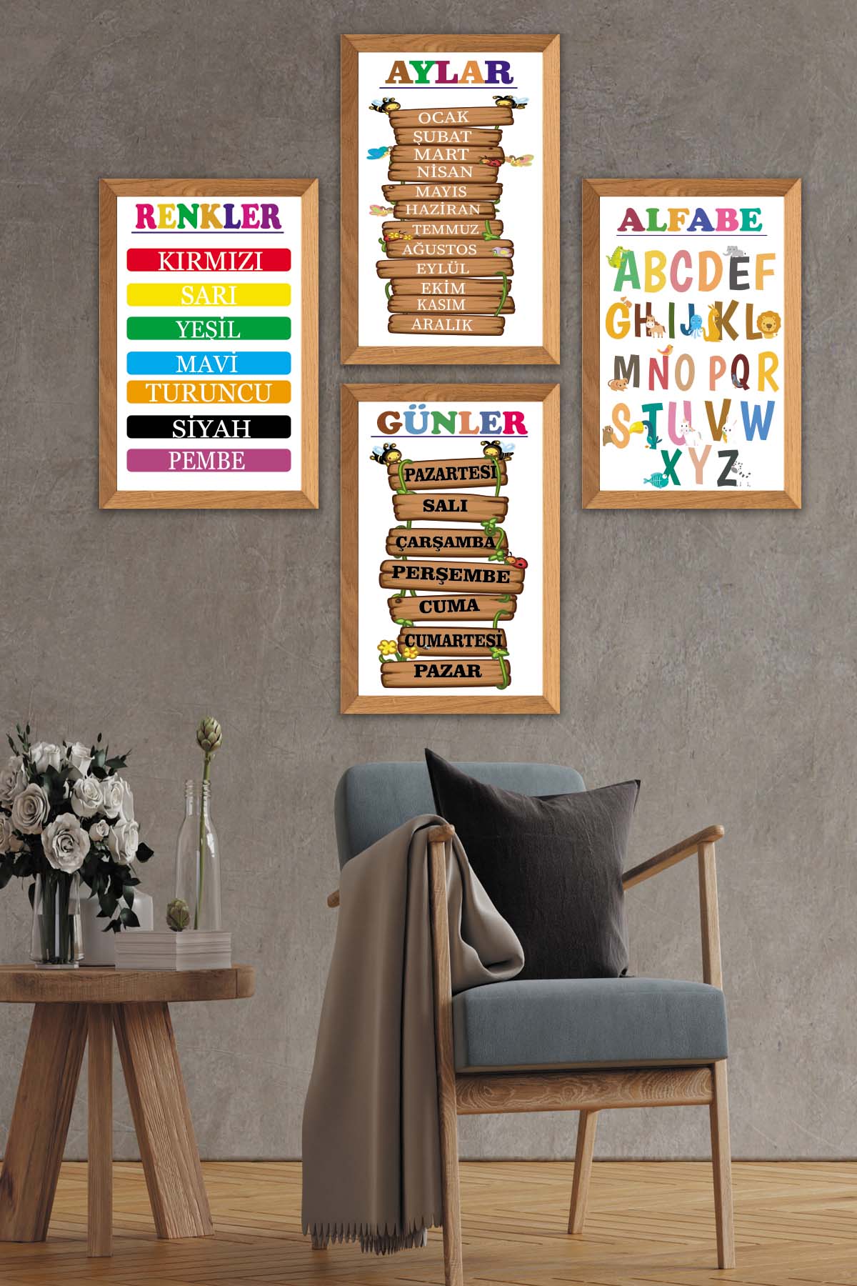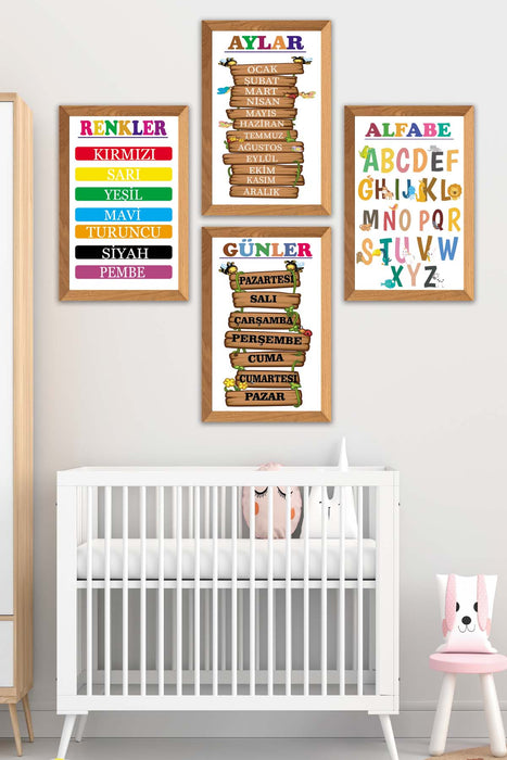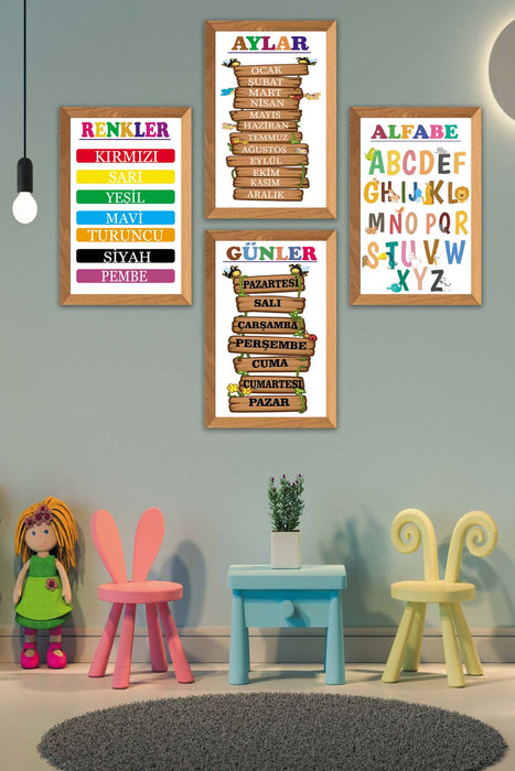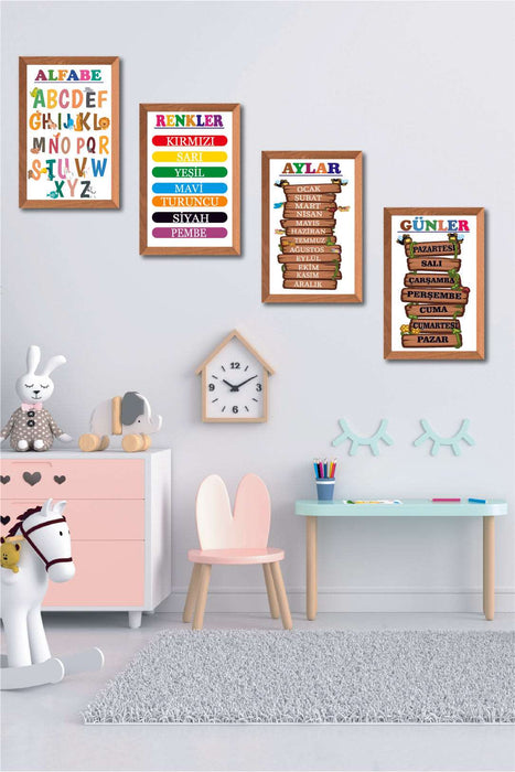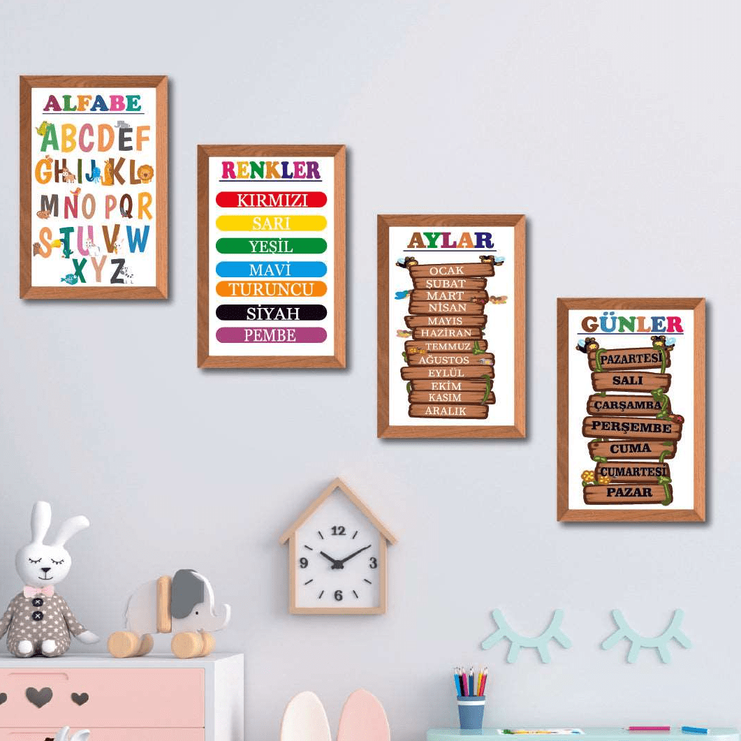 Orijinal World of Walls 4 Parça Çoçuklar İçin Renkli Alfabe Sayılar ve Aylar Eğitici Duvar Tablo Çerçeve Görünümlü