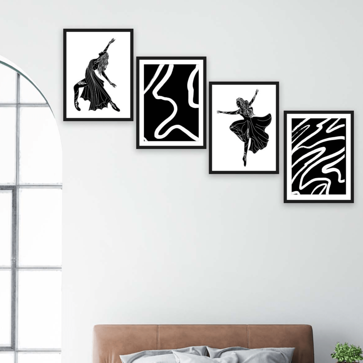 Orijinal World of Walls 4 Parça Siyah Beyaz Dans Siyah Çerçeve Görünümlü Tasarım Uv Baskı Mdf Ahşap Duvar Tablo Seti