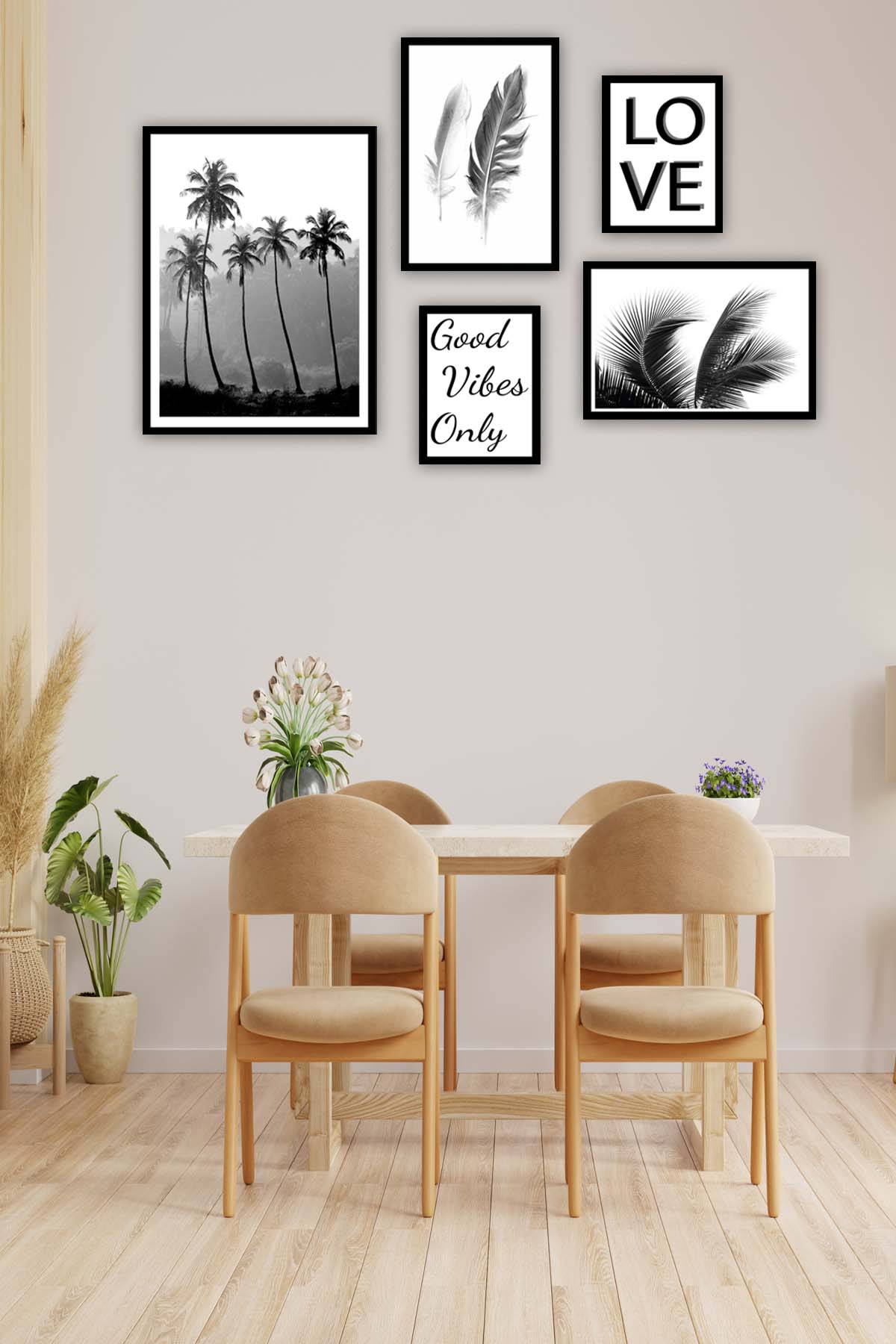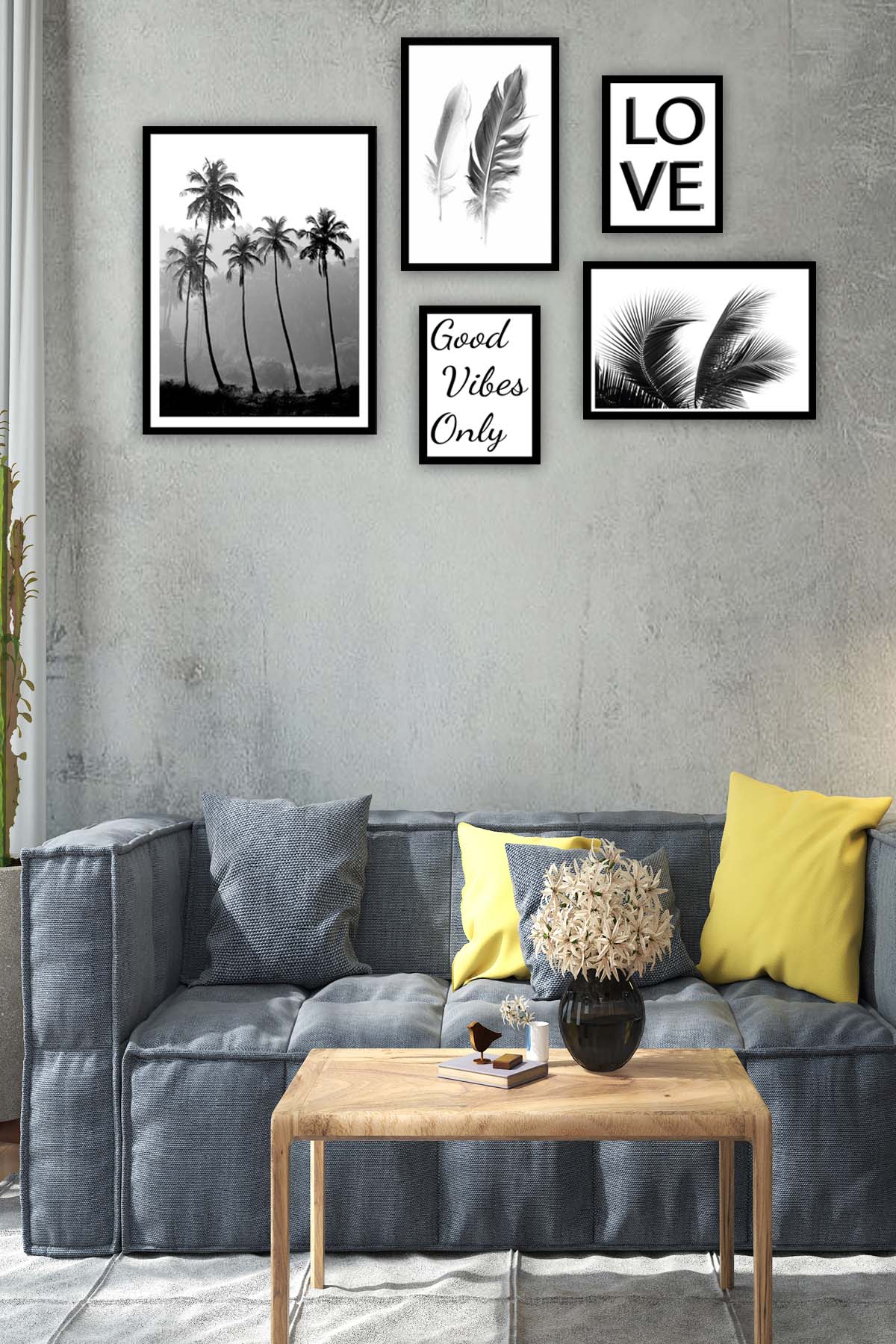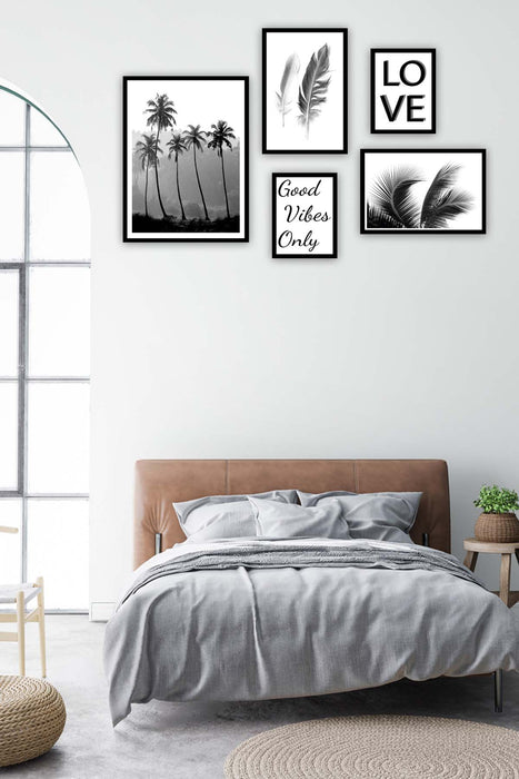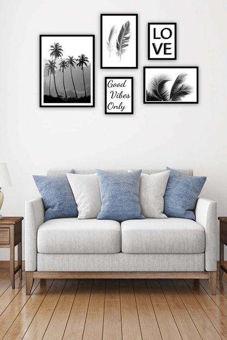 Orijinal World of Walls 5 Parça Siyah Beyaz Yaprak Siyah Çerçeve Görünümlü Duvar Tablo Seti