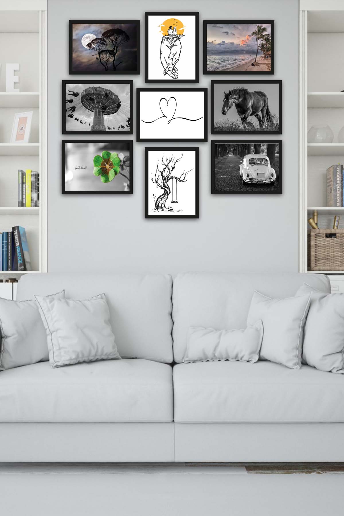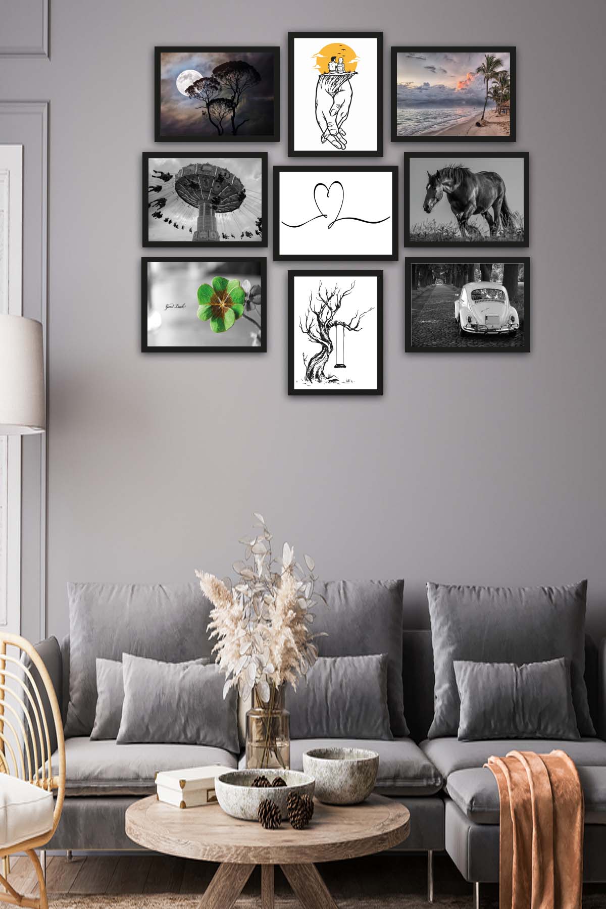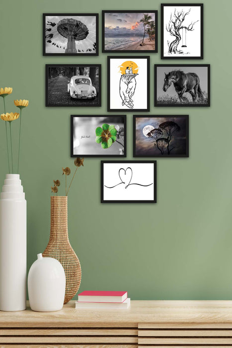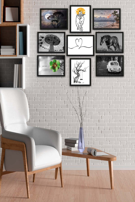 Orijinal World of Walls 9 Parça Siyah Beyaz Tarzında Siyah Çerçeve Görünümlü Uv Baskı Mdf Ahşap Duvar Tablo Seti