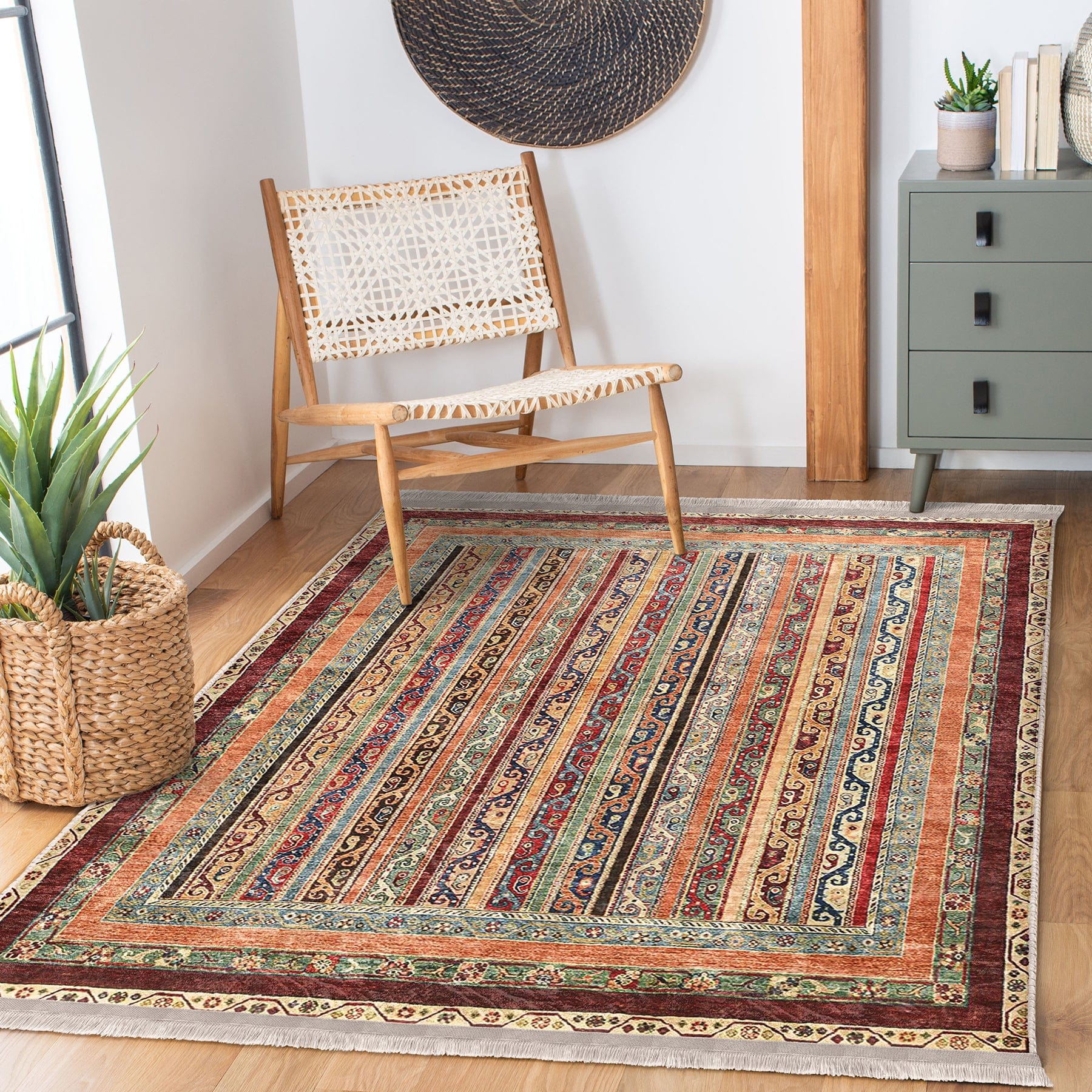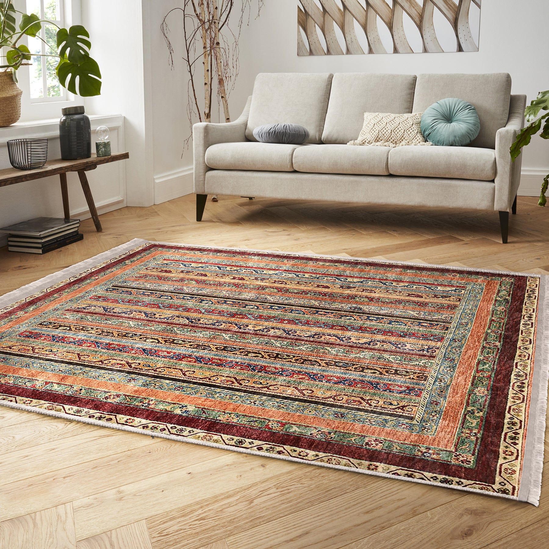 Bej Kilim Motifli Geleneksel Desenli Avangarde Etnik Dijital Baskılı Makinede Yıkanabilir Saçaklı Halı