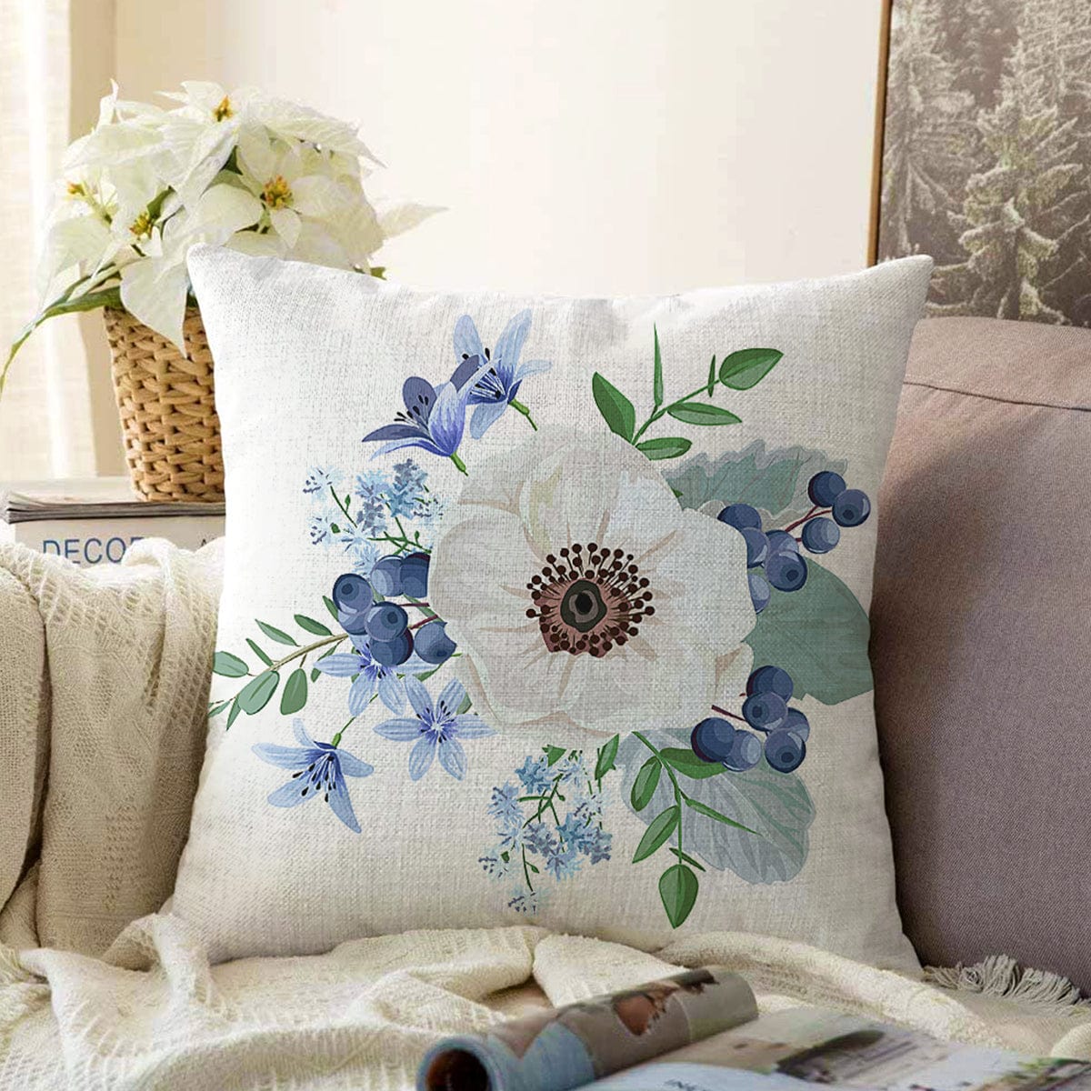 Beyaz Gül Tasarımlı Dijital Baskılı Modern Raşel Kadife Yastık Kırlent Kılıfı