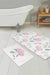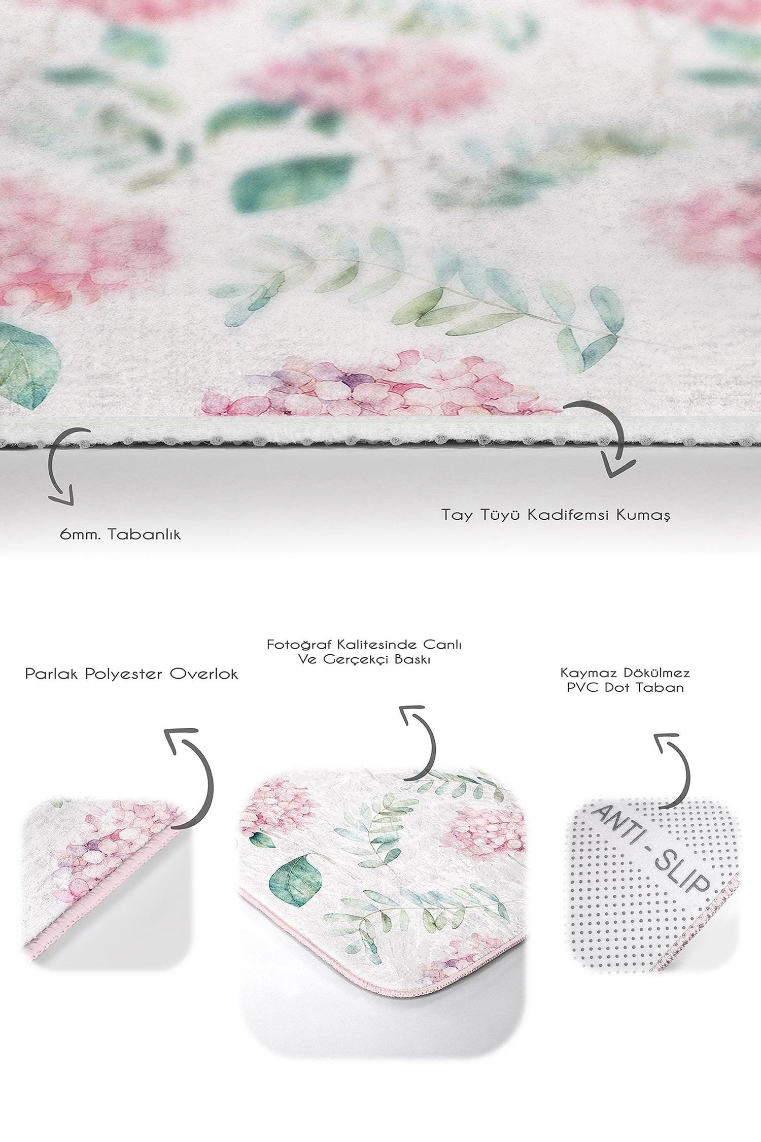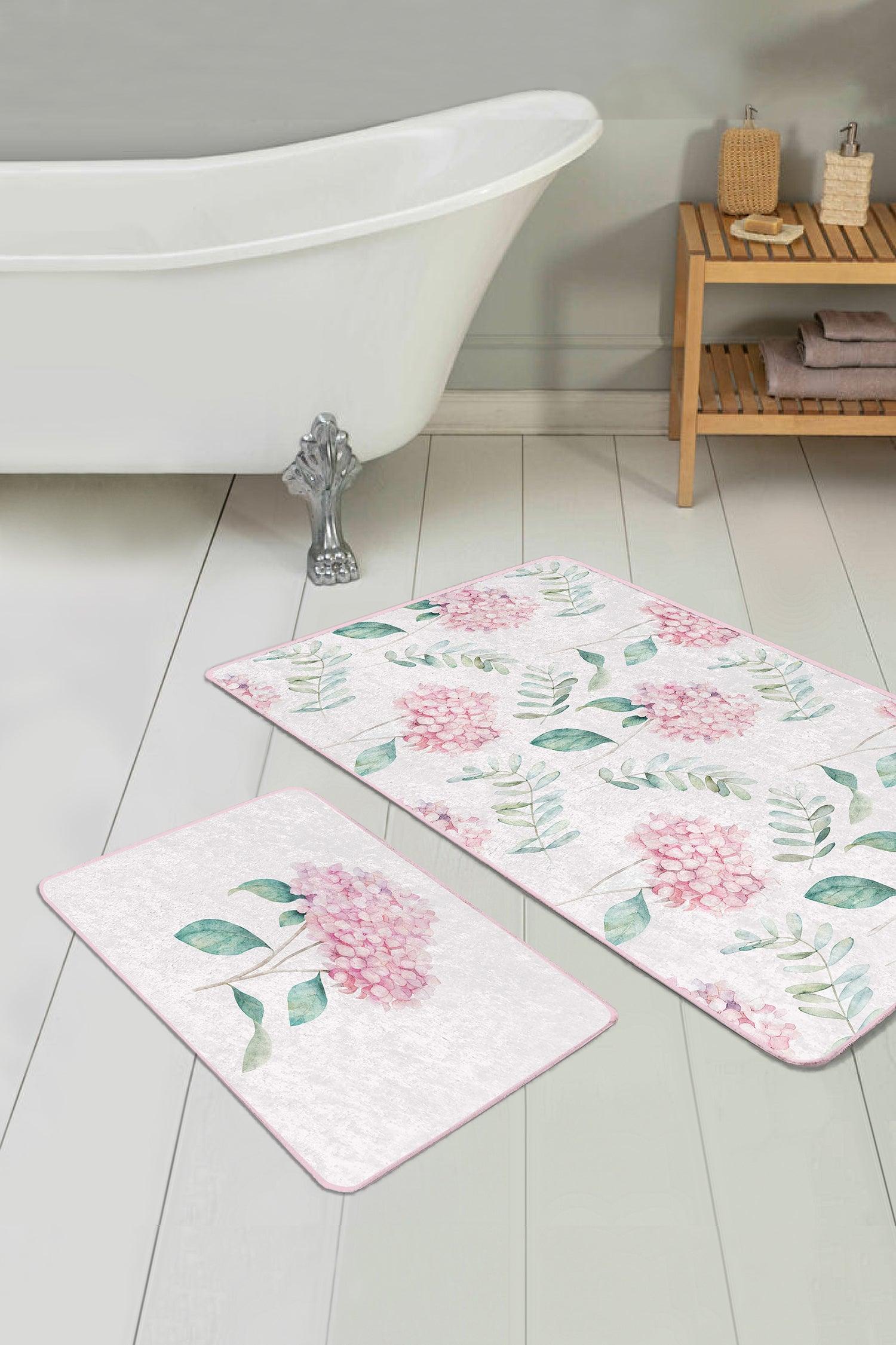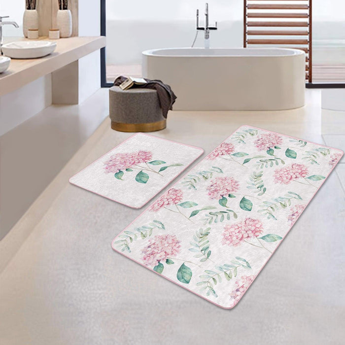 Beyaz Zemin Ortanca Çiçeği Dijital Baskılı 2li Halı Takımı Kaymaz Taban Yıkanabilir