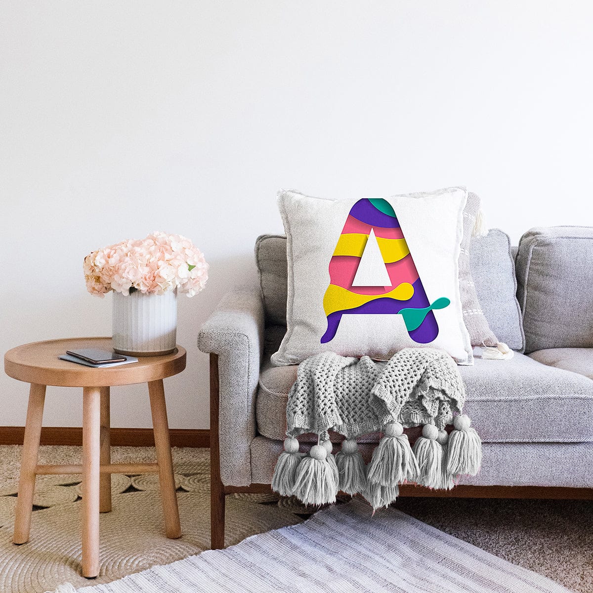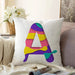 Beyaz Zemin Renkli A Harfli Özel Tasarım Dijital Baskılı Raşel Kadife Yastık Kırlent Kılıfı
