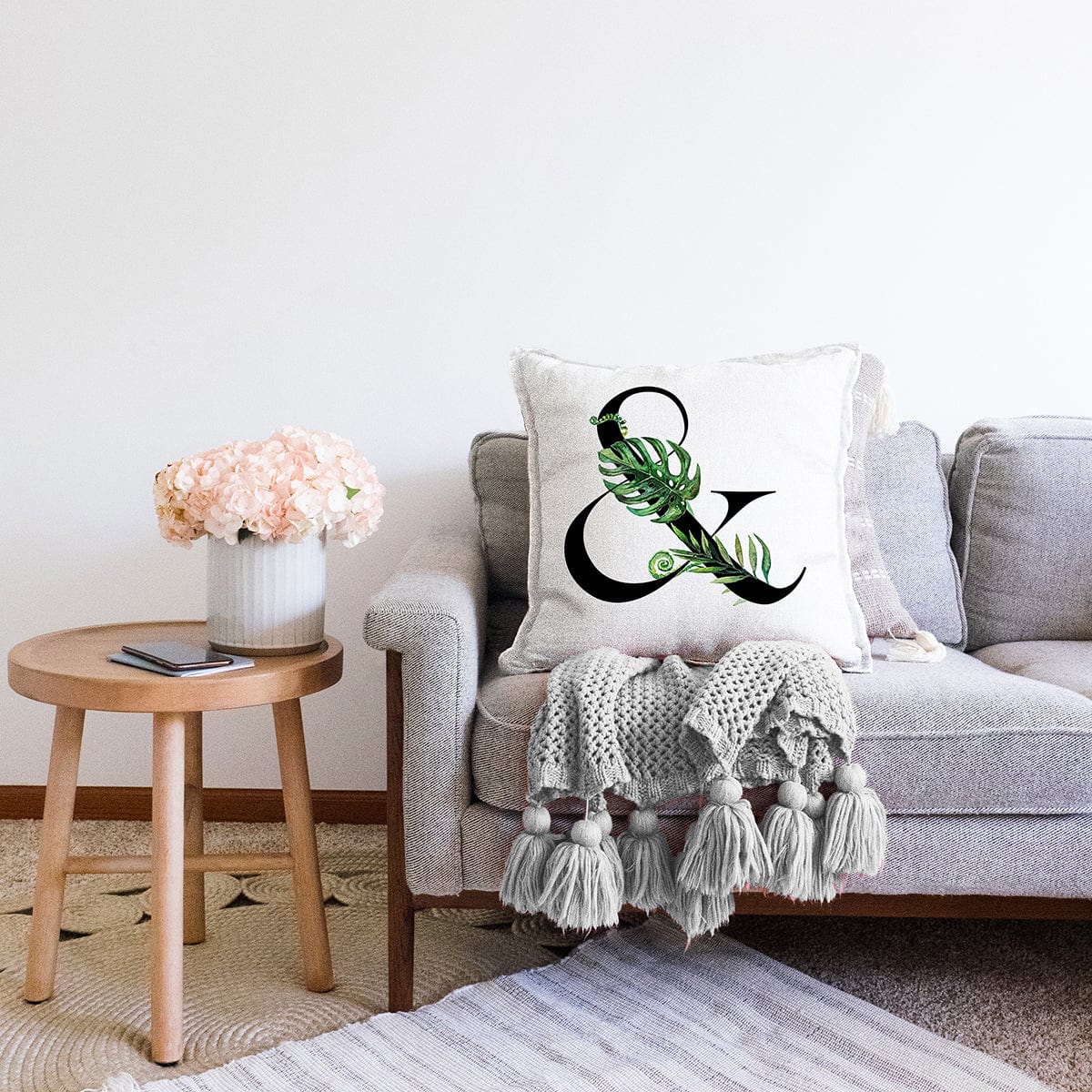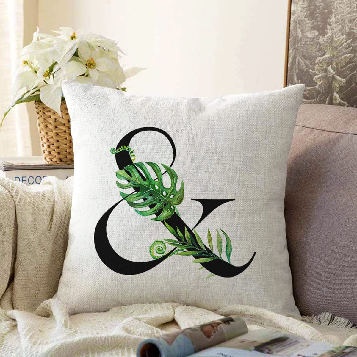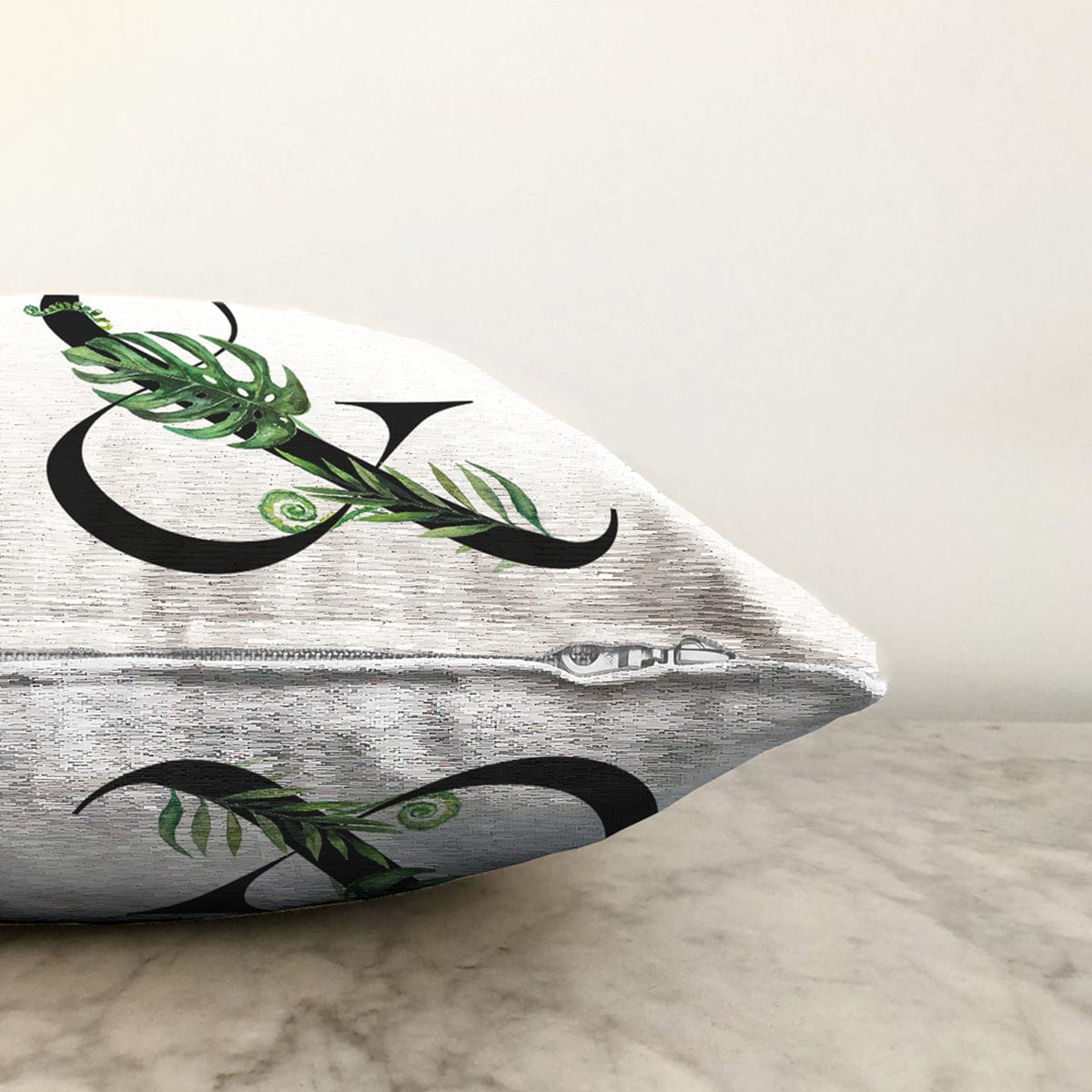 Beyaz Zemin Yaprak Motifli Siyah & Harfi Özel Tasarım Dijital Baskılı Raşel Kadife Yastık Kırlent Kılıfı