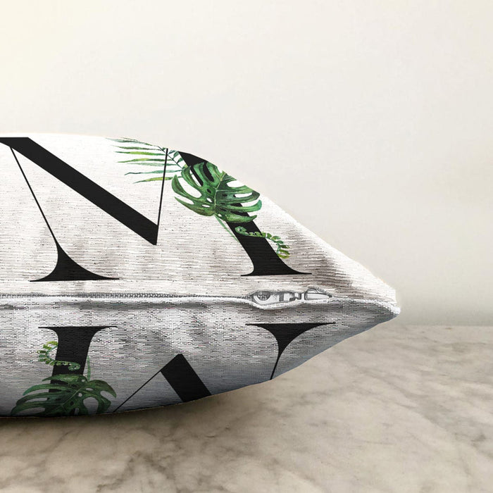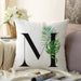 Beyaz Zemin Yaprak Motifli Siyah M Harfi Özel Tasarım Dijital Baskılı Raşel Kadife Yastık Kırlent Kılıfı
