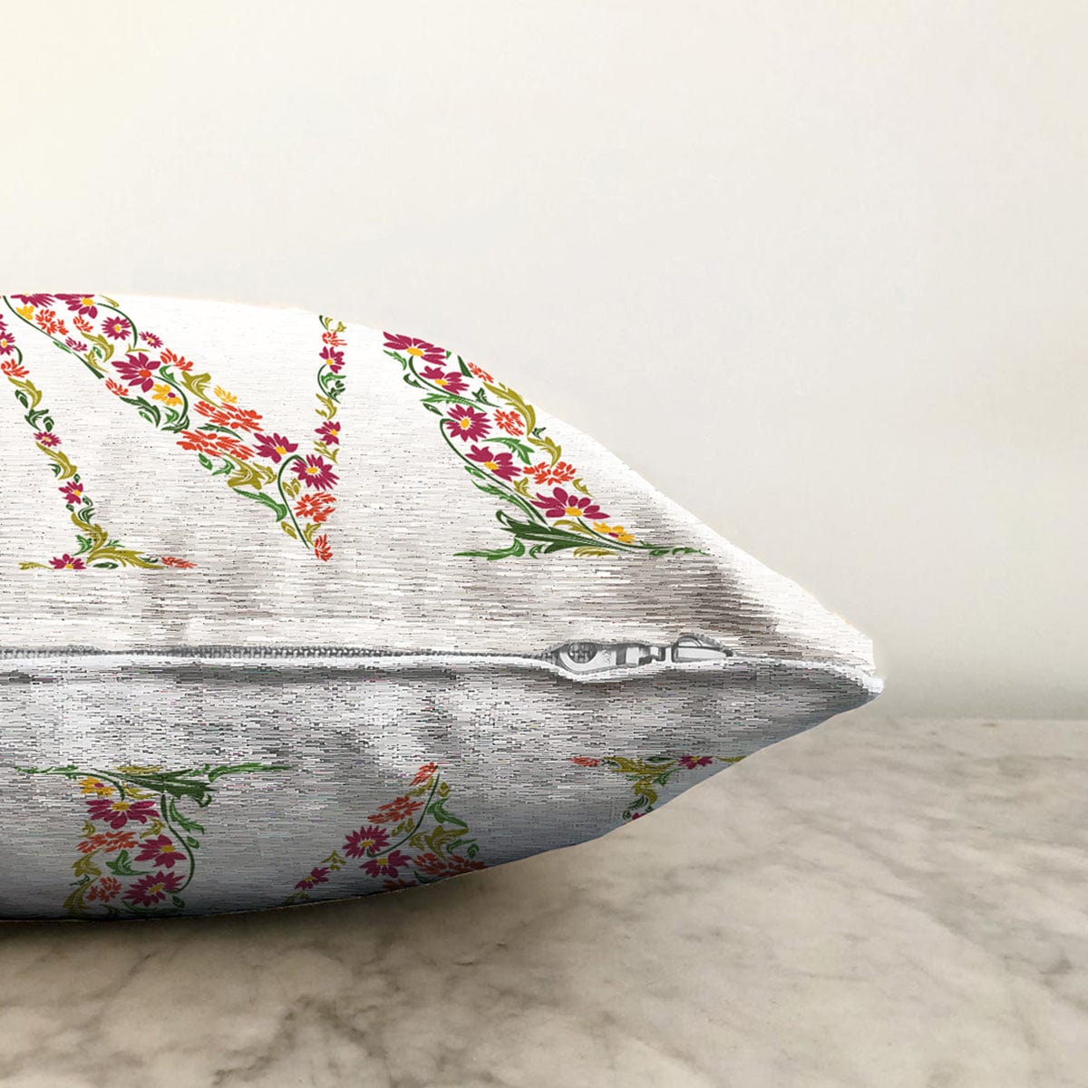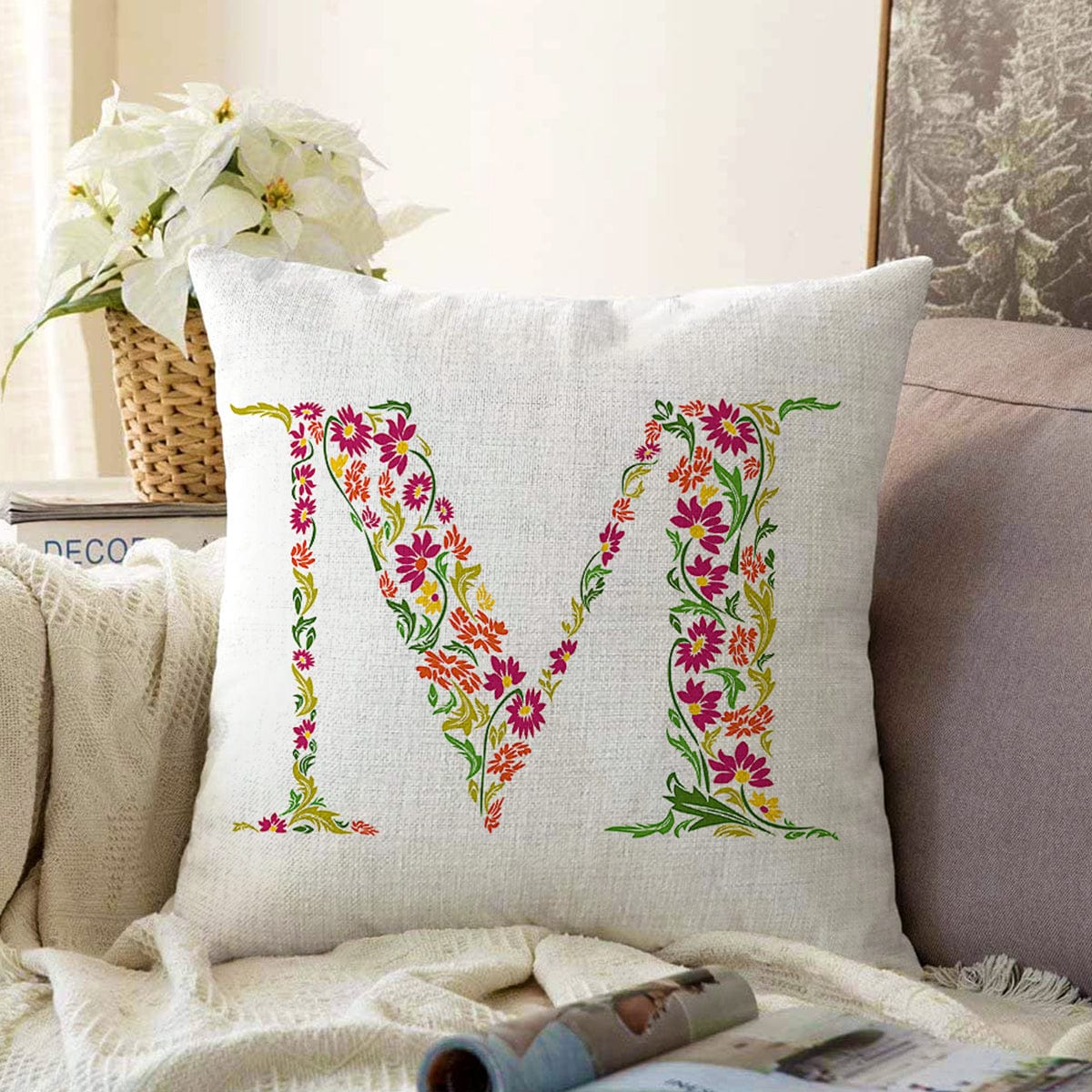 Beyaz Zemin Yaprak Temalı M Harfi Özel Tasarım Dijital Baskılı Raşel Kadife Yastık Kırlent Kılıfı