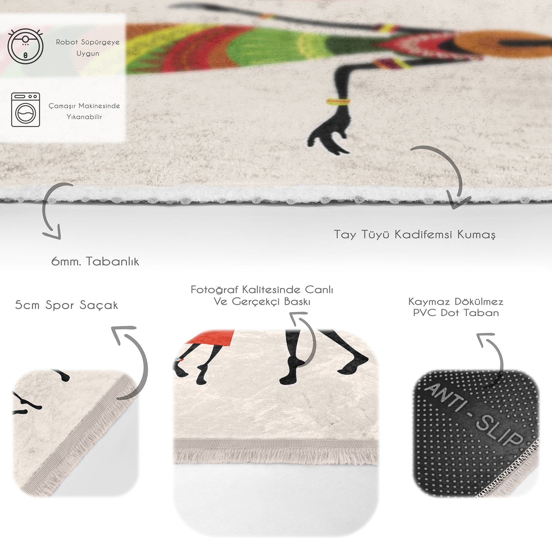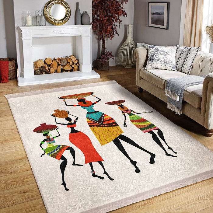 Beyaz Etnik Motifli Afrika Kadın Desenli Etnik Klasik Dijital Baskılı Makinede Yıkanabilir Saçaklı Halı