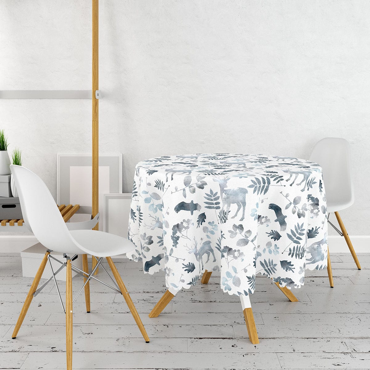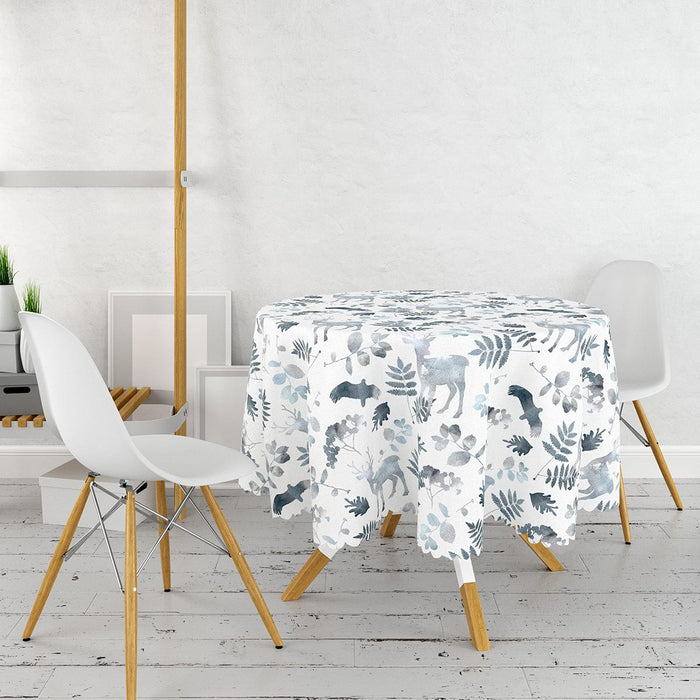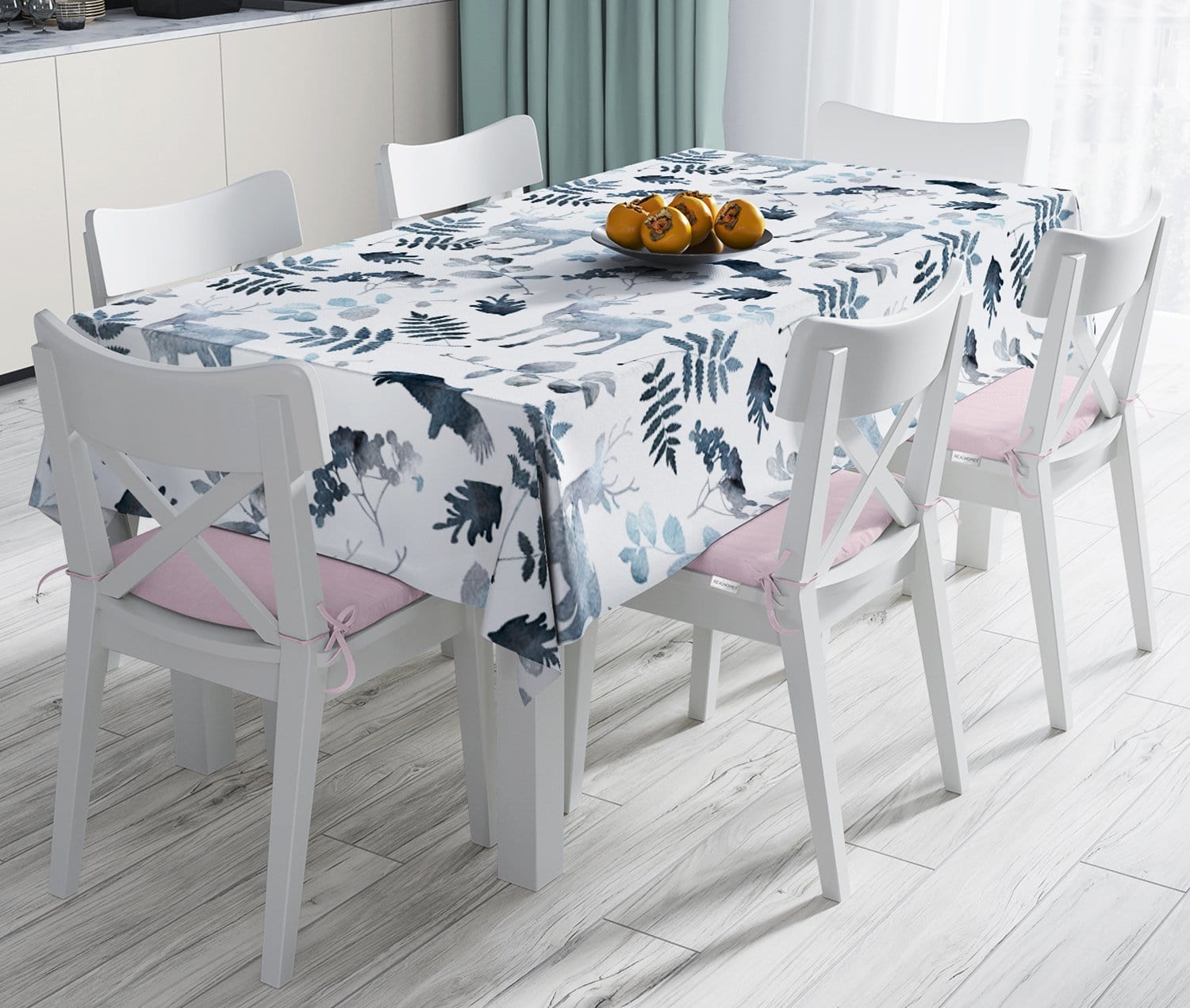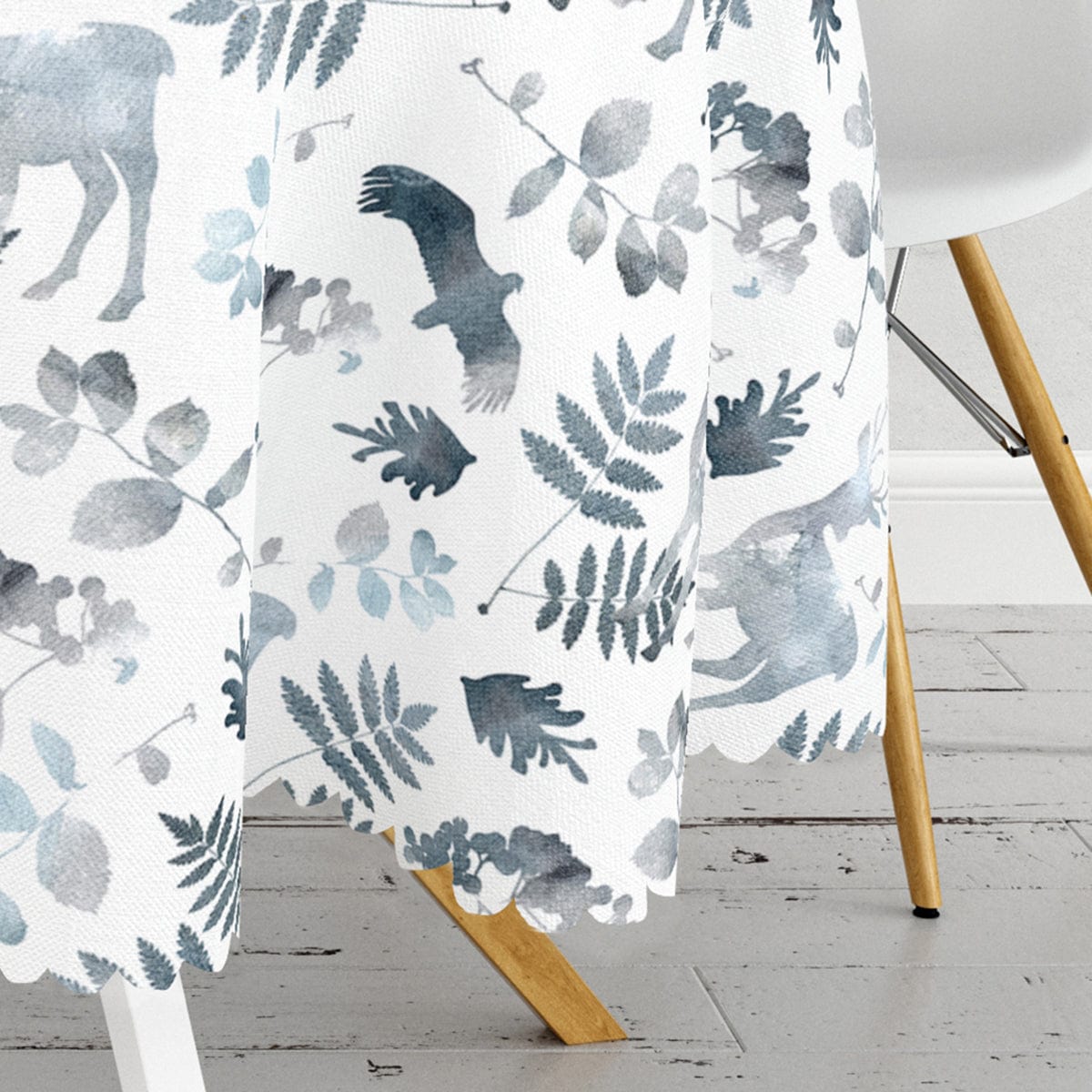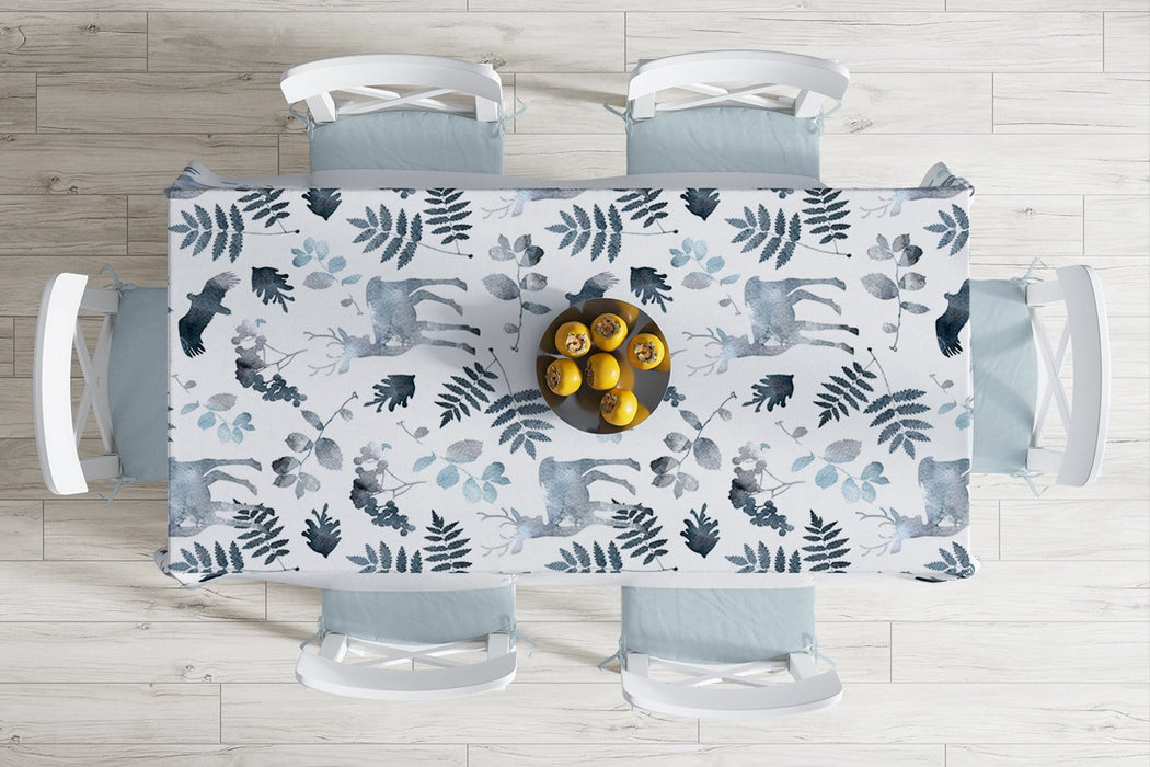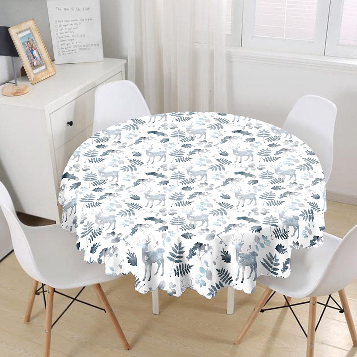 Beyaz Zeminli Geyik ve Yaprak Motifleri Dijital Baskılı Leke Tutmaz Masa Örtüsü