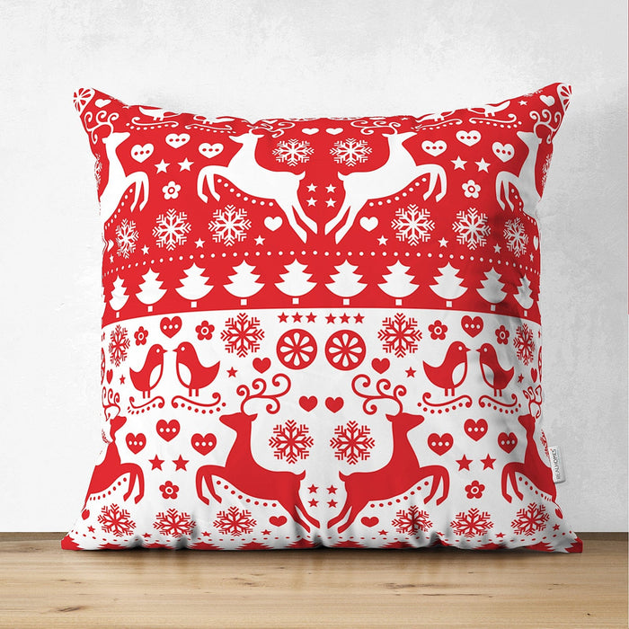 Çift Taraflı Kırmızı Beyaz Yılbaşı Geyikleri Dijital Baskılı Süet Yastık Kırlent Kılıfı