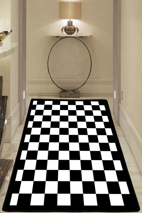 Damalı Checkers Siyah Beyaz Dijital Baskılı Halı, Kaymaz Taban, Yıkanabilir