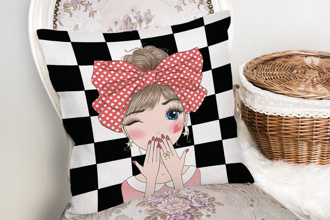 Damalı Fashion Girl Dijital Baskılı Modern Yastık Kılıfı 43x43cm