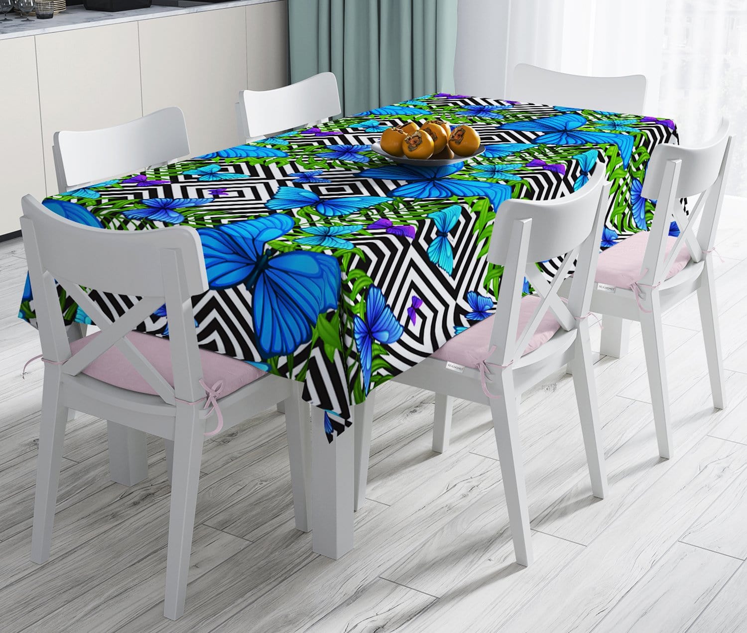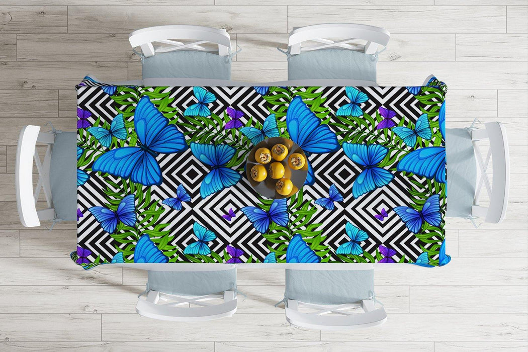 Geometrik Zeminli Mavi Kelebek Baskılı Leke Tutmaz Masa Örtüsü