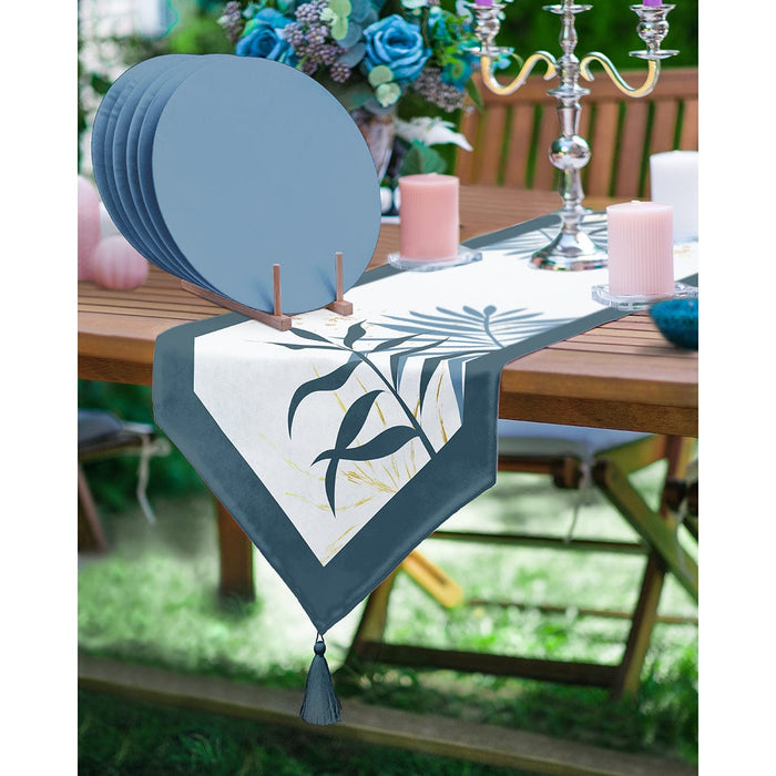 Gold Detaylı Yaprak Tasarımlı Üçgen Püsküllü Runner 1 Adet ve 6 Adet Mavi Renkli Supla