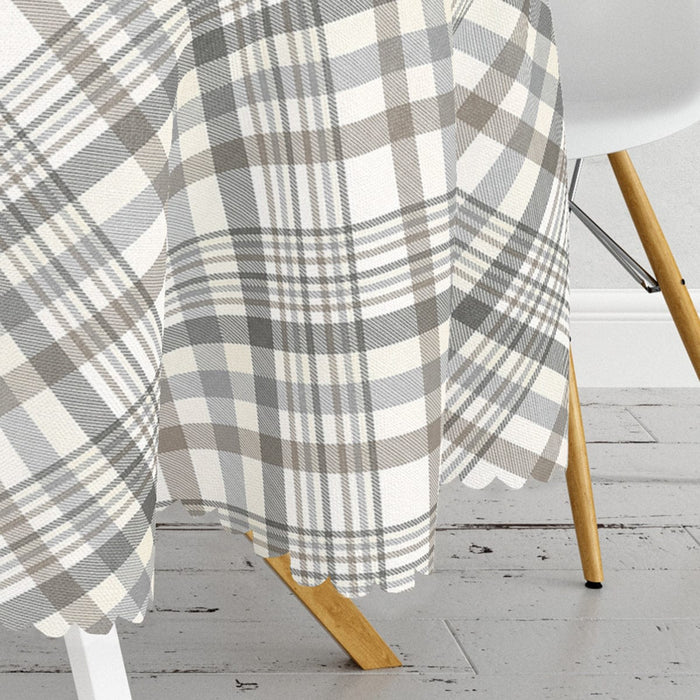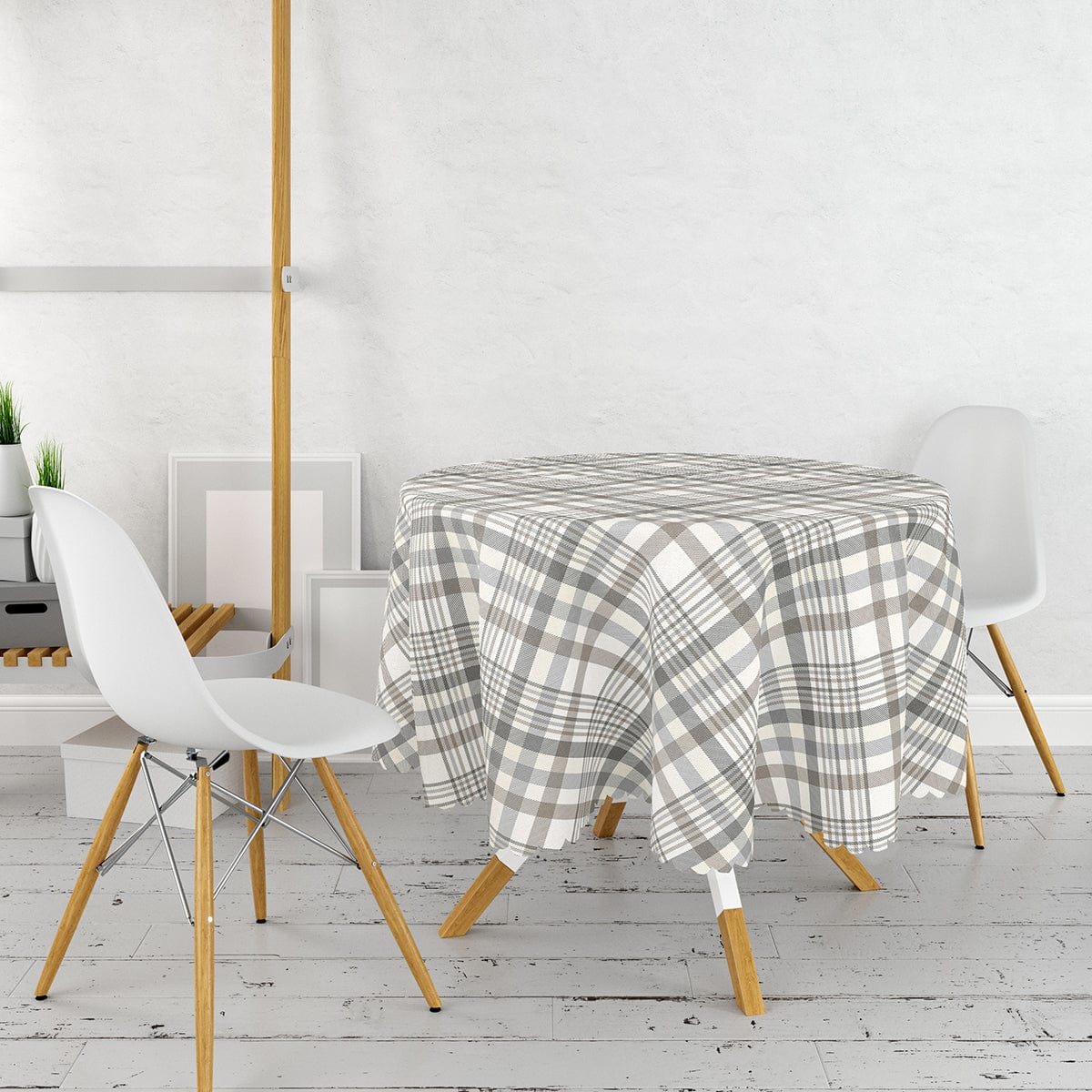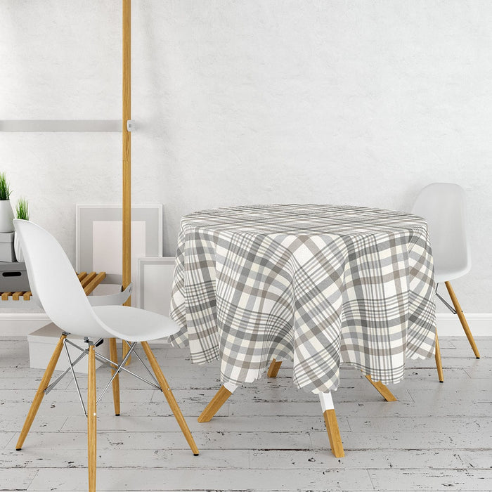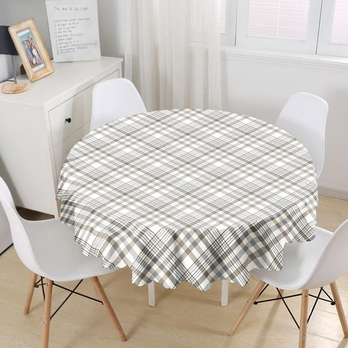 Gri Krem Ekose Desenli Dijital Baskılı Dekoratif Leke Tutmaz Yuvarlak Masa Örtüsü