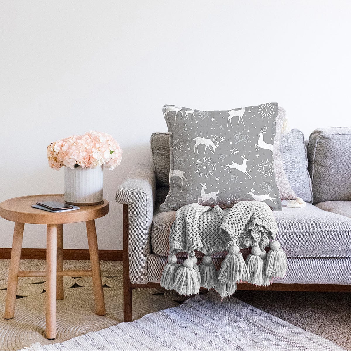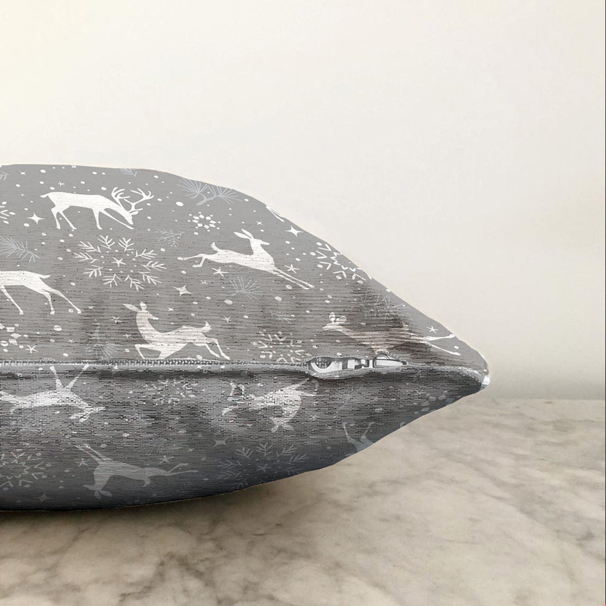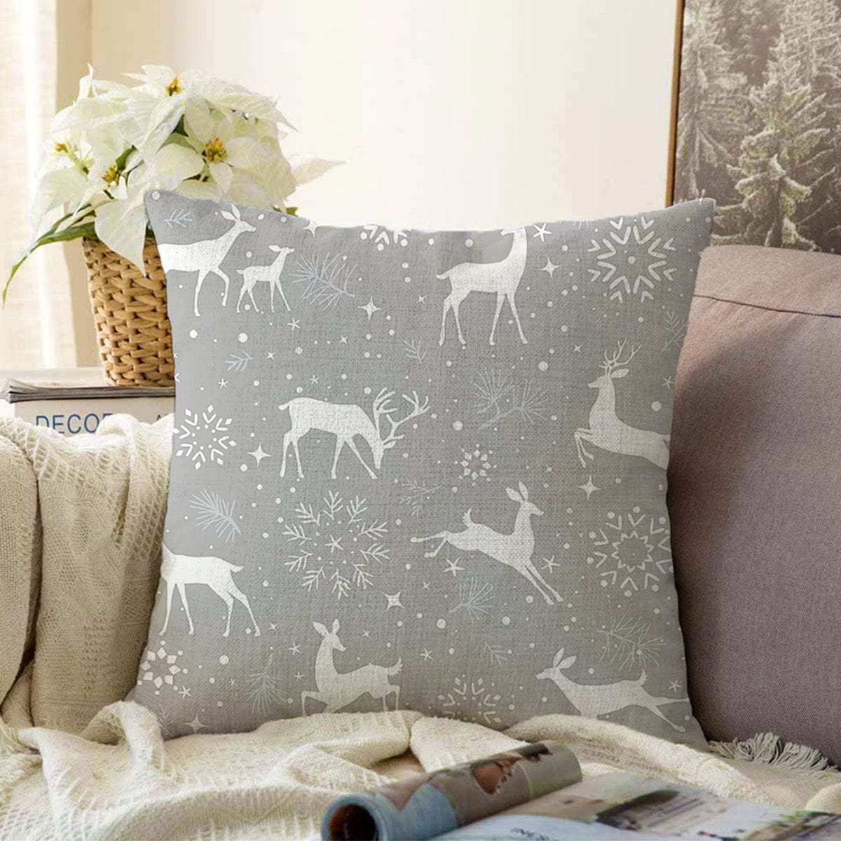 Gri Zemin Üzerinde Geyik Desenli Dijital Baskılı Modern Raşel Kadife Yastık Kırlent Kılıfı