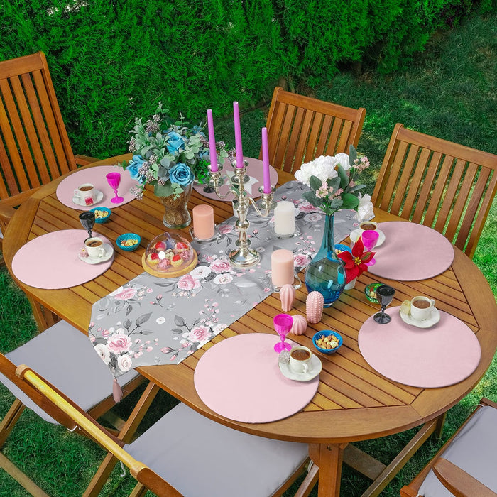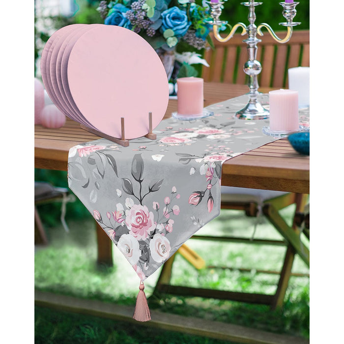 Gri Zeminde Gül Tasarımlı Üçgen Püsküllü Runner 1 Adet ve 6 Adet Pembe Renkli Supla