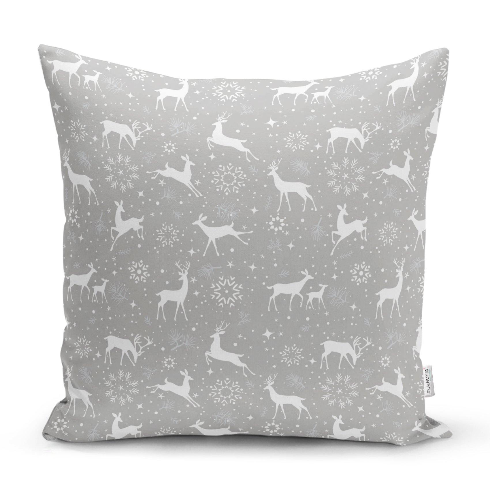 Gri Zeminli Geyikler ve Kar Taneleri Tasarımlı Dijital Baskılı Yastık Kırlent Kılıfı 43x43cm