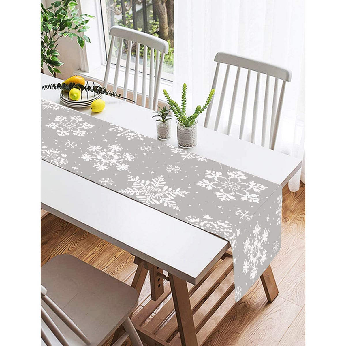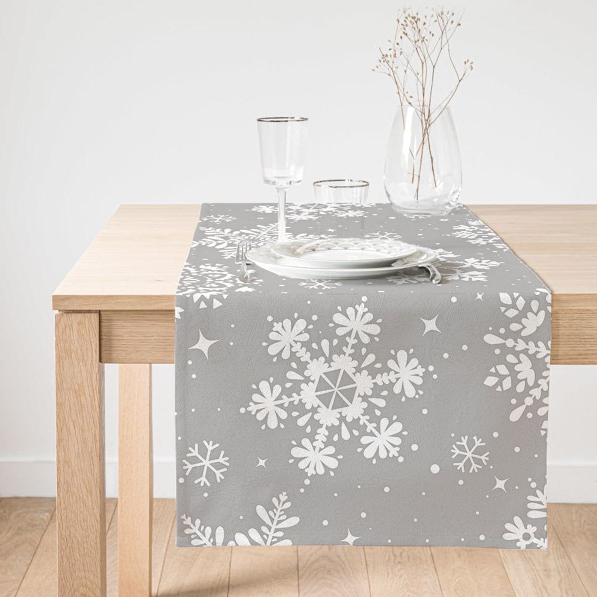 Gri Zeminli Kar Taneleri Temalı Modern Tasarım Dekoratif Özel Tasarım Süet Runner