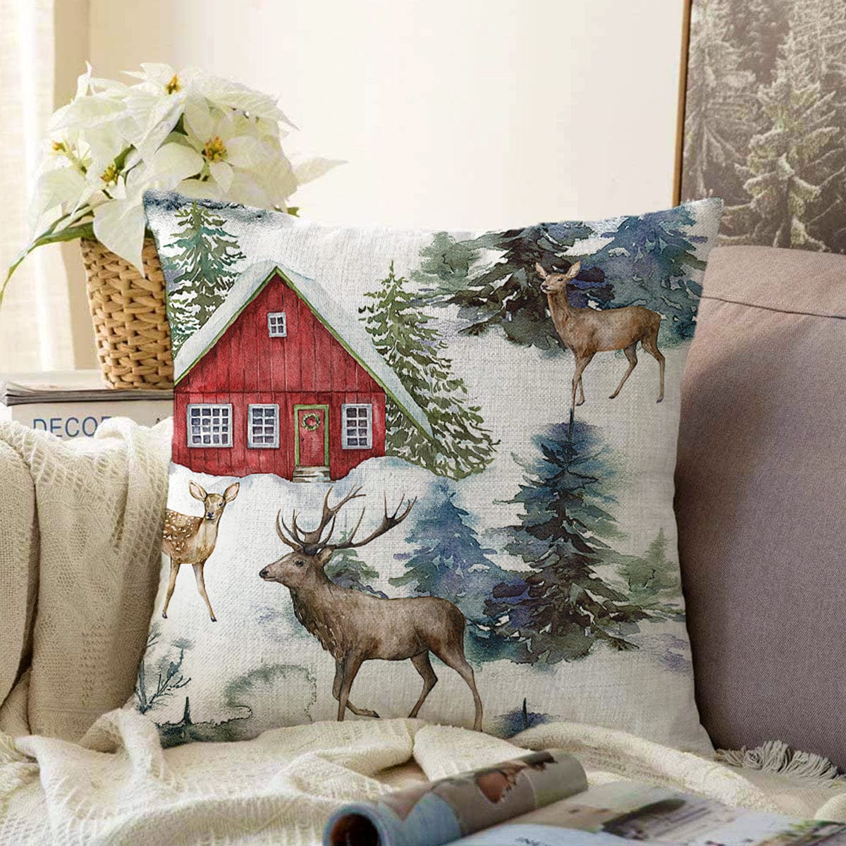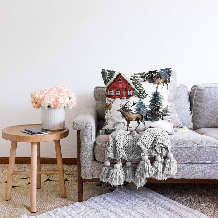 Kar Zeminli Geyik & Çam Ağacı Tasarımlı Dijital Baskılı Dekoratif Raşel Kadife Yastık Kırlent Kılıfı
