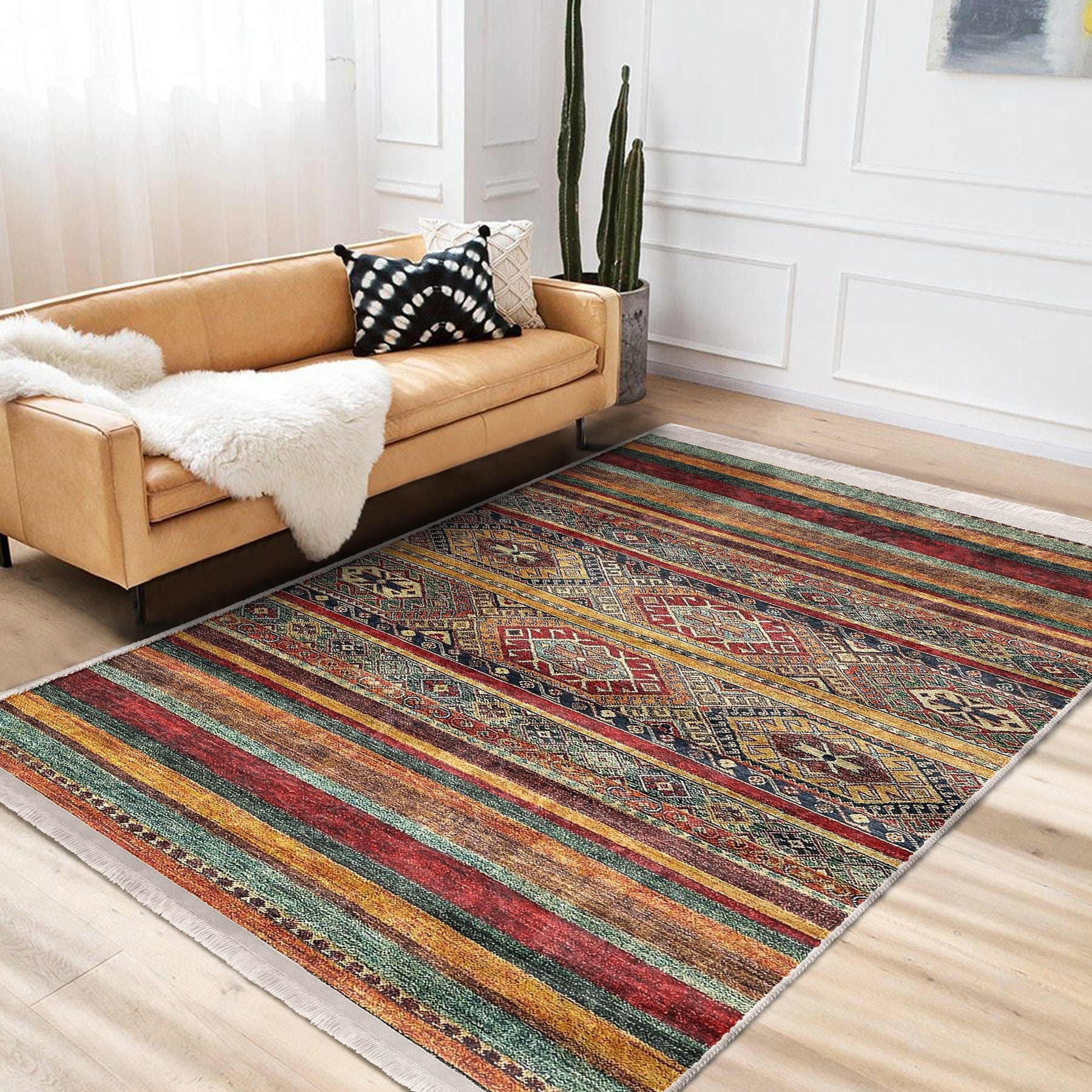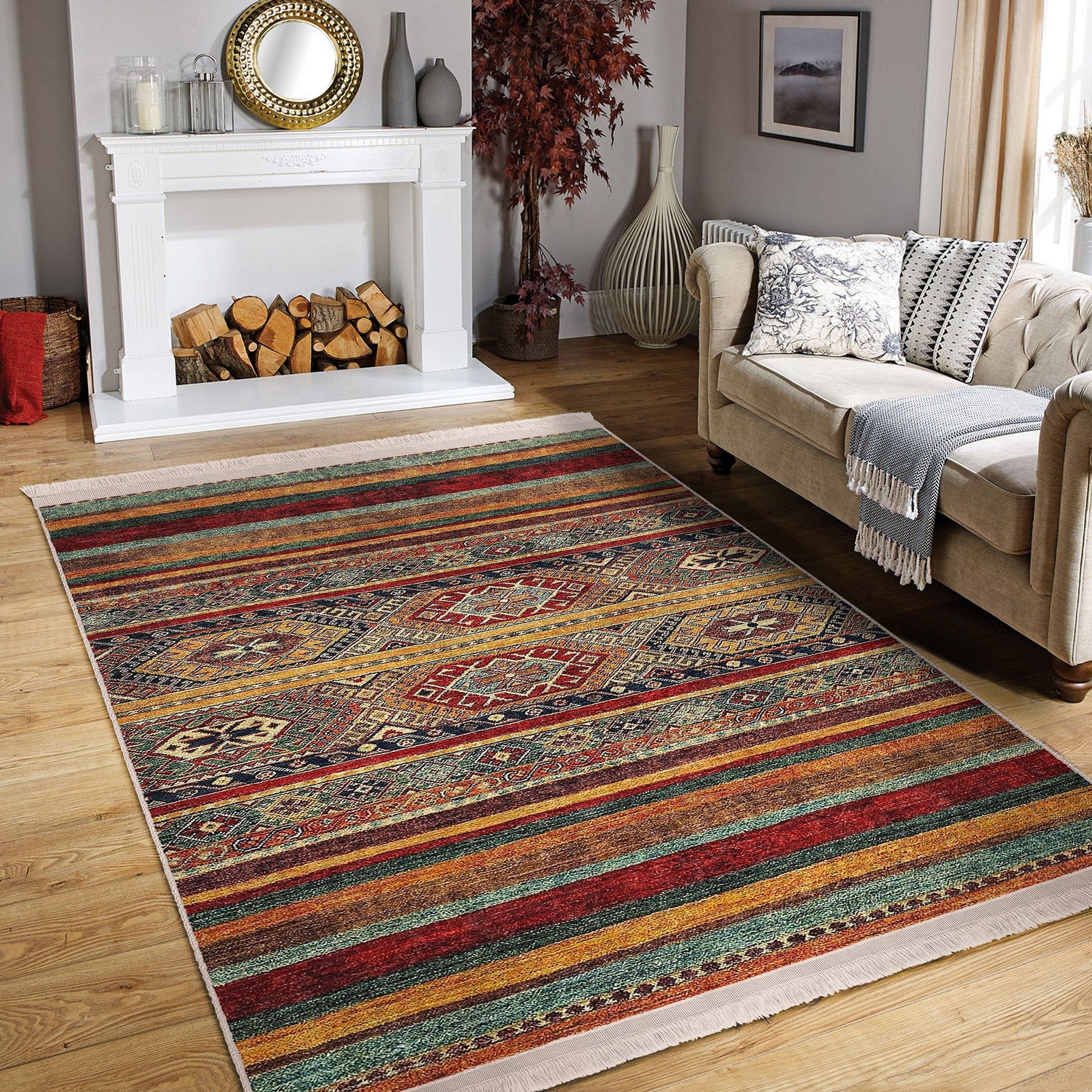 Kırmızı - Kahverengi Geleneksel Motifli Kilim Desenli Vintage Etnik Dijital Baskılı Makinede Yıkanabilir Saçaklı Halı