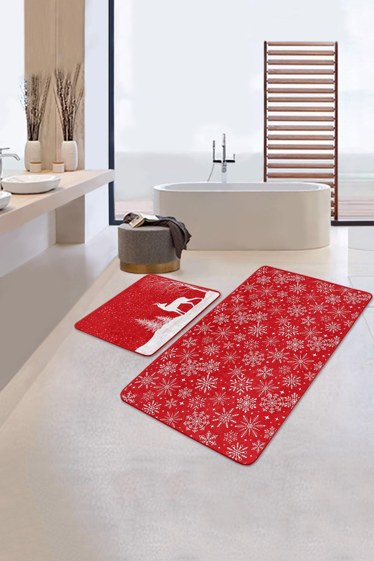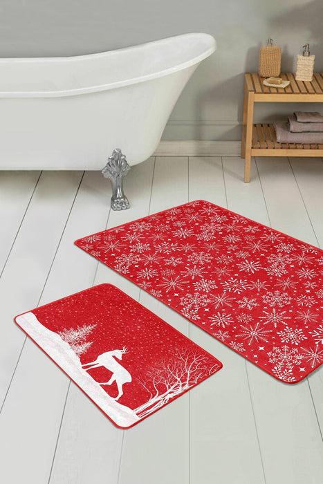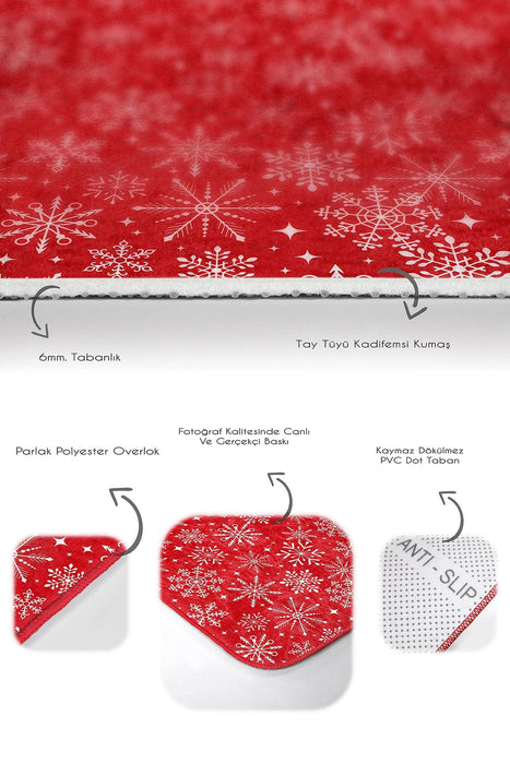 Kırmızı Zemin Yılbaşı Temalı Kar Taneleri 2li Halı Takımı Kaymaz Taban Yıkanabilir
