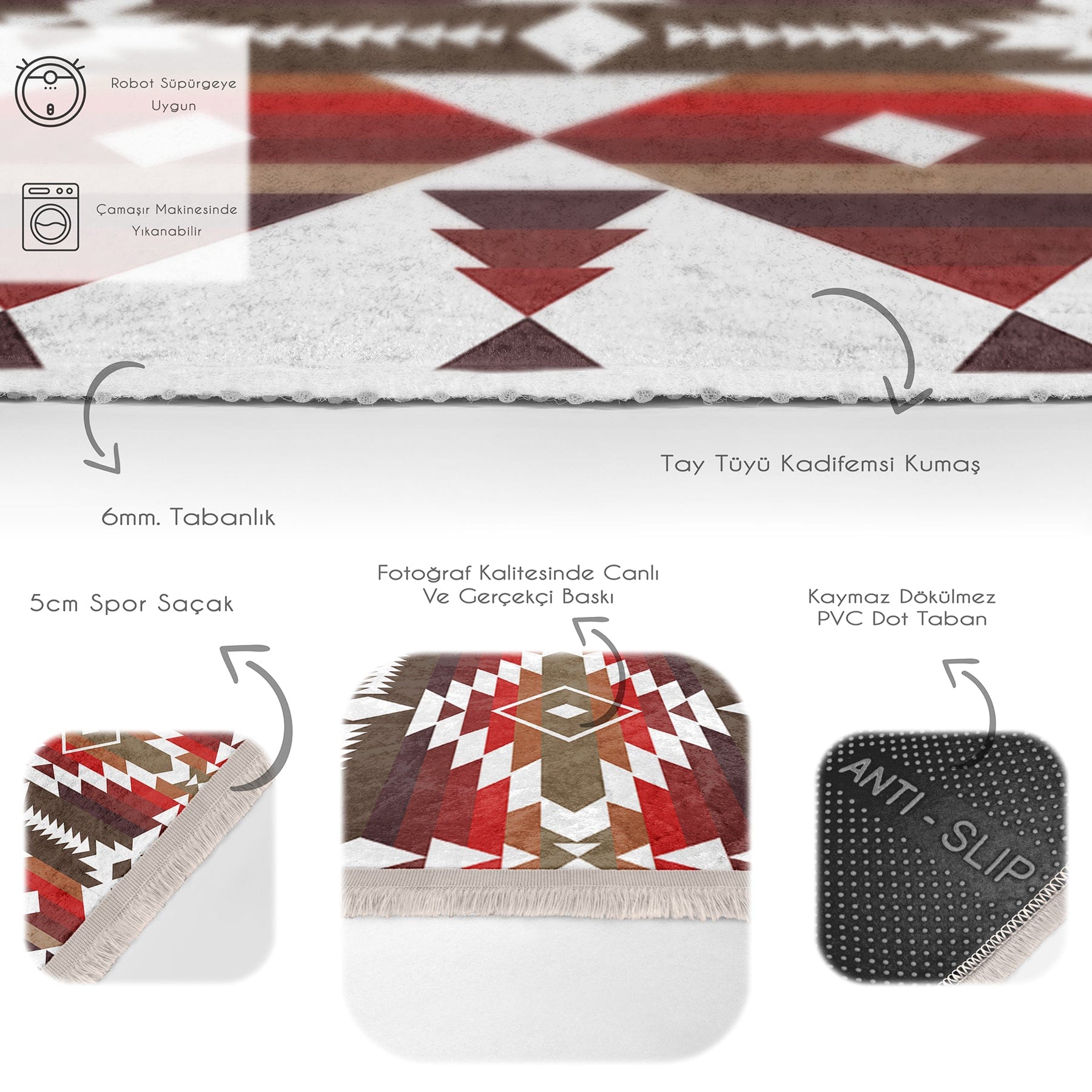 Saçaklı deluxe halı modellerimiz ile evinize bambaşka bir hava katın. Canlı renkleri ve özgün desenleriyle binlerce modeli sizler için tasarladık. Ürün Ölçüleri: Evinize uygun farklı farklı ölçü seçenekleri bulunmaktadır. Kumaş: Kadife Kumaş; tüy toplamaz ve leke tutmaz. Baskı: Canlı ve gerçekçi 3D dijital baskı, kullanıma ve yıkamaya bağlı solmaz. Tabanlık ve Dolgu: 5 mm kaymaz dokuma tabanlıdır. Kenar Türü: Püsküllü olarak üretilmektedir. Leke tutmaz ve makinede yıkanabilir. Bonvagon'da satılan tüm Denizli tekstil ürünleri 1. sınıf iplik, boya, kumaş ve baskı kalitesine sahiptir. Üreticimizin kuralları gereği ürün iadesinin sipariş teslim tarihinden sonraki iki iş günü içinde yapılması gerekmektedir.