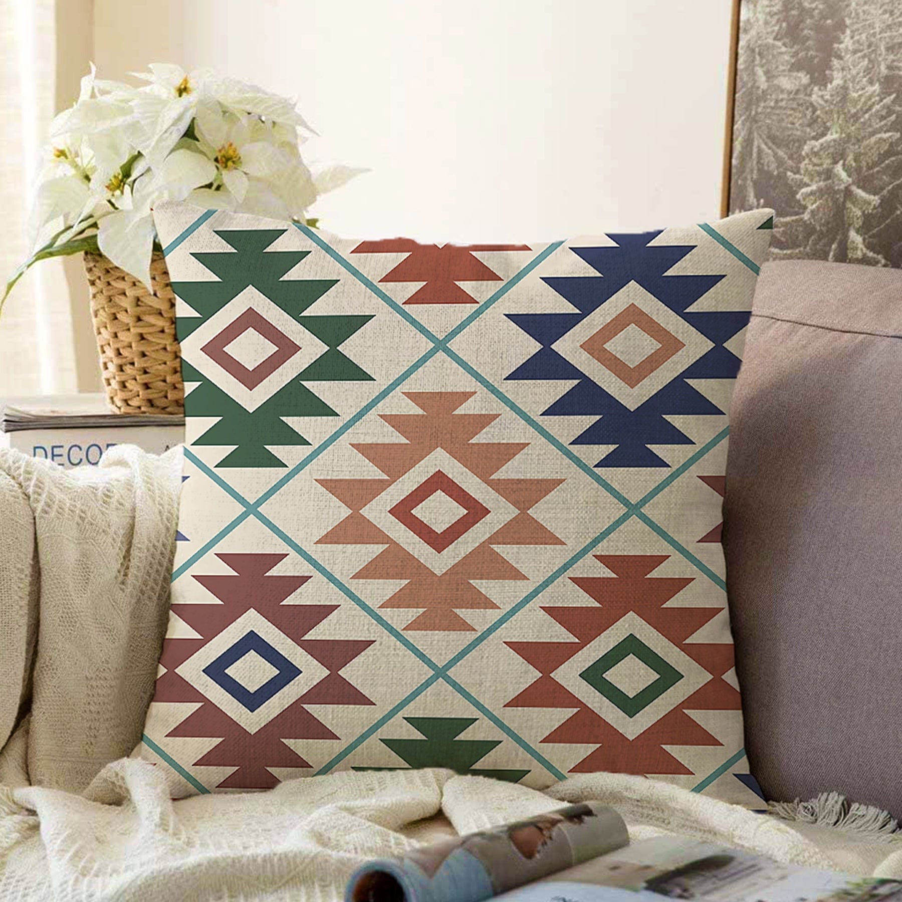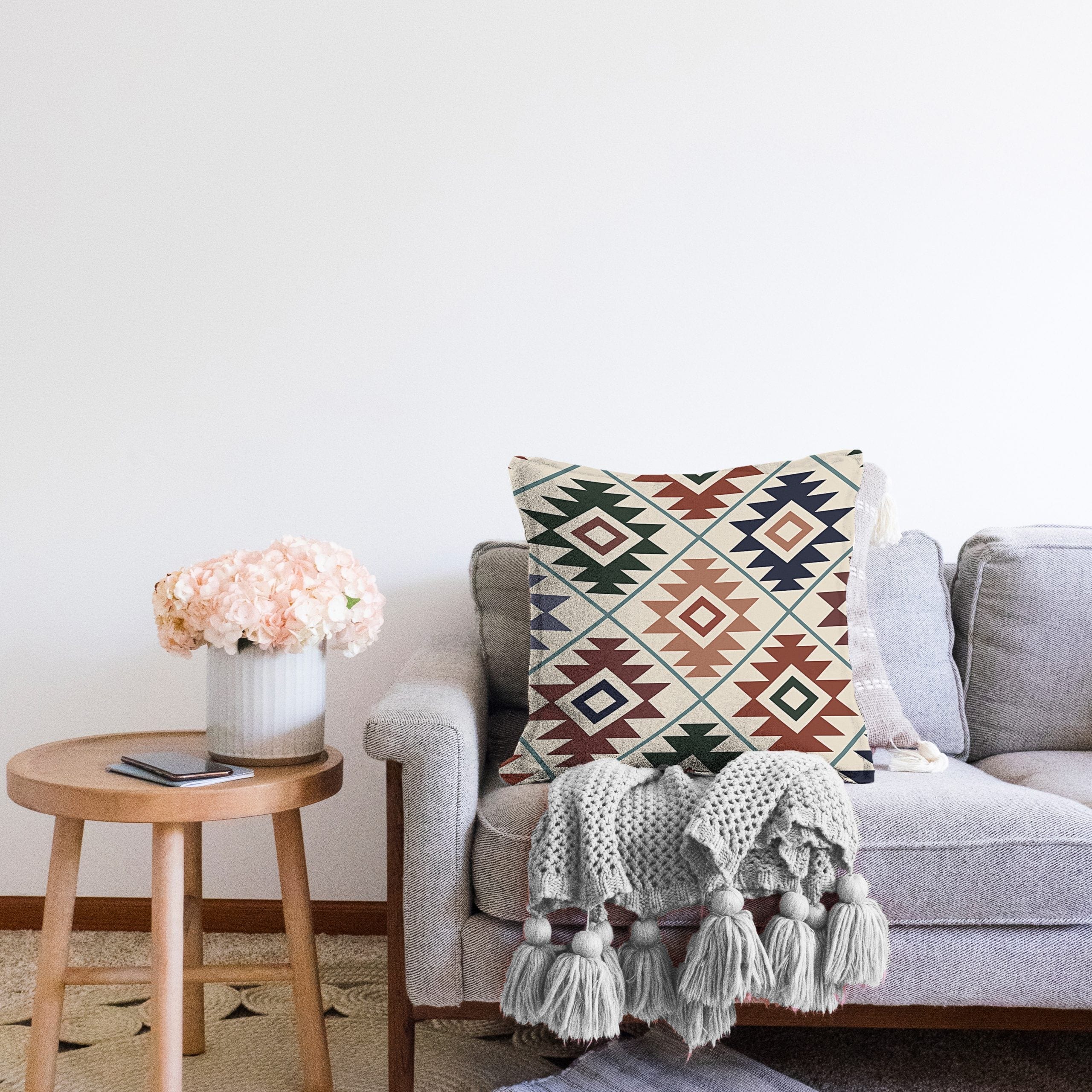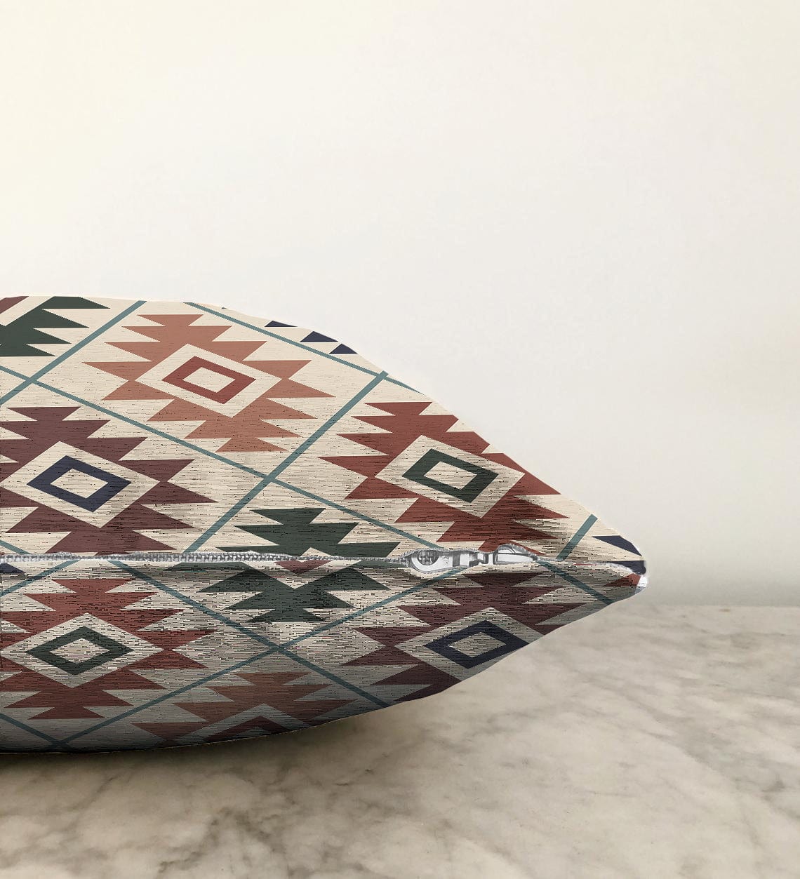Krem Zemin Etnik Geometrik Motifli Dijital Baskılı Raşel Kadife Yastık Kırlent Kılıfı