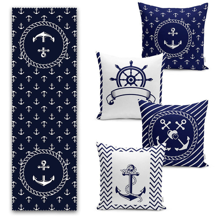 Lacivert Denizci Desenli Çapa ve Dümen Tasarımlı 4 Kırlent 1 Runner Seti