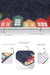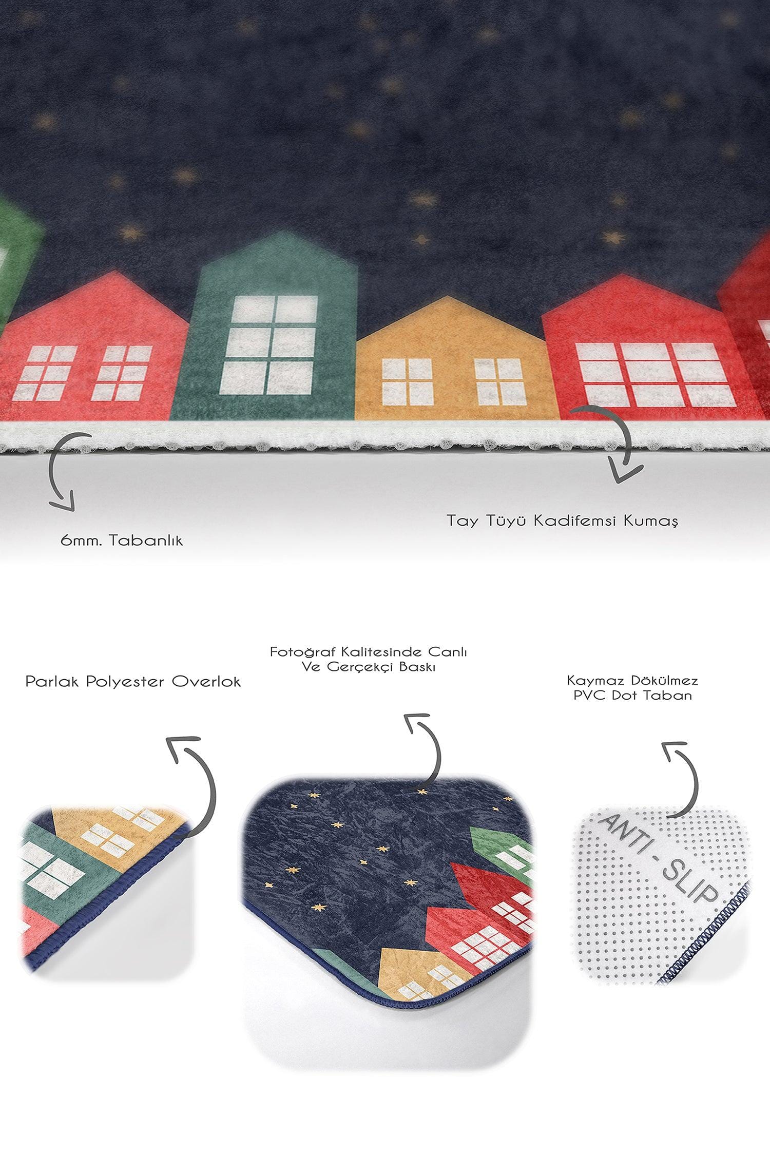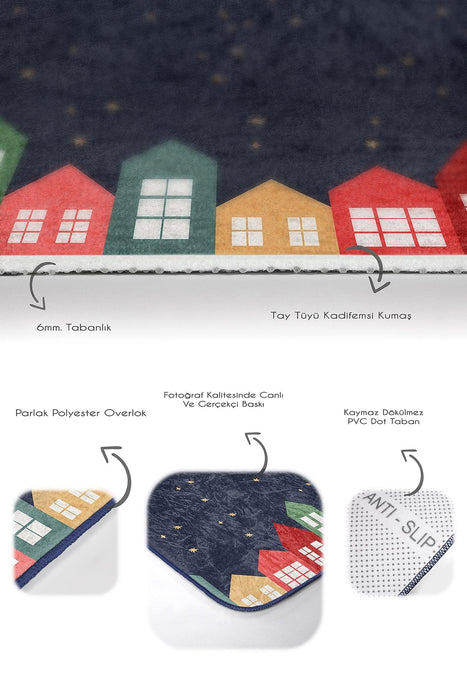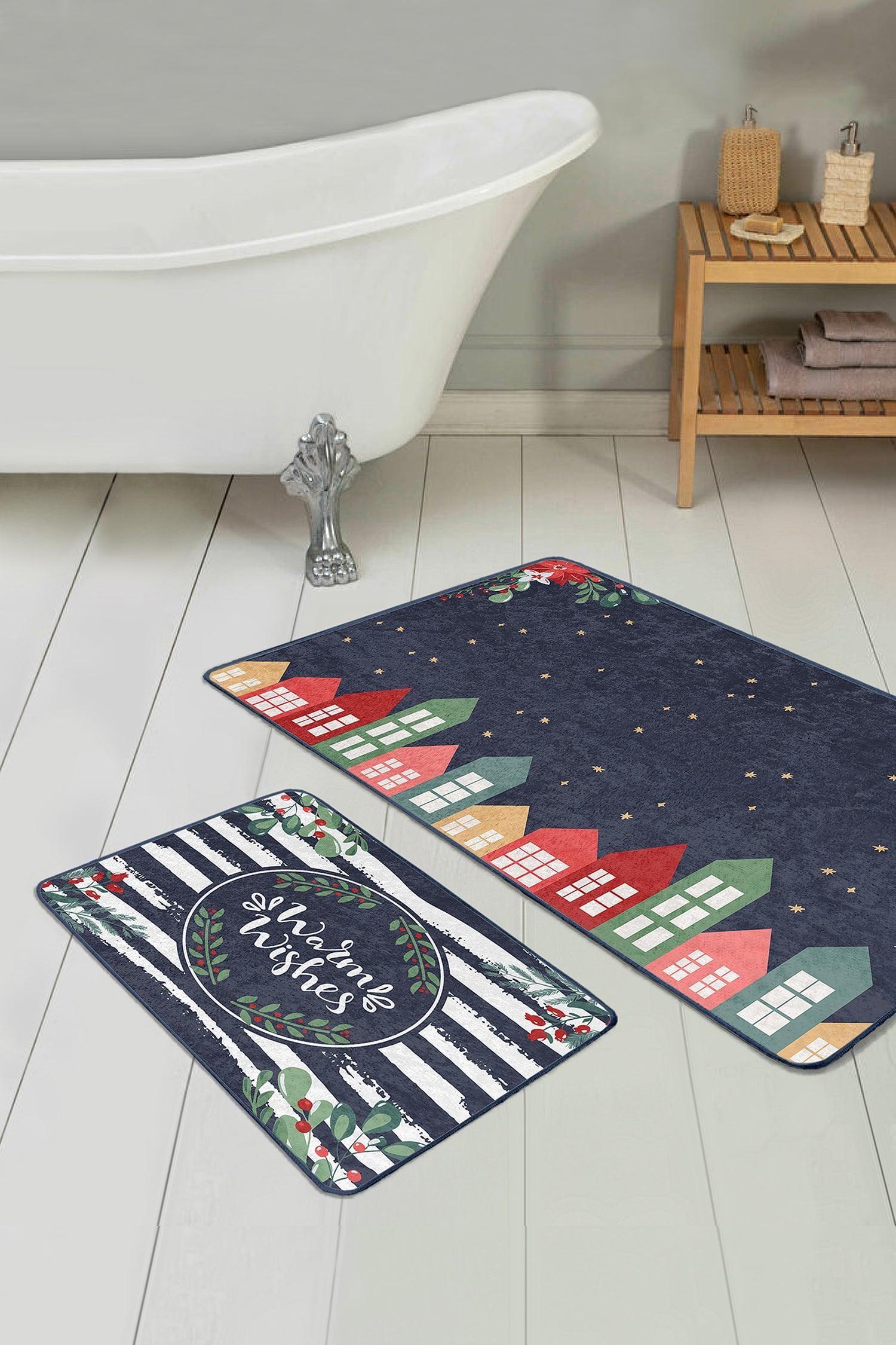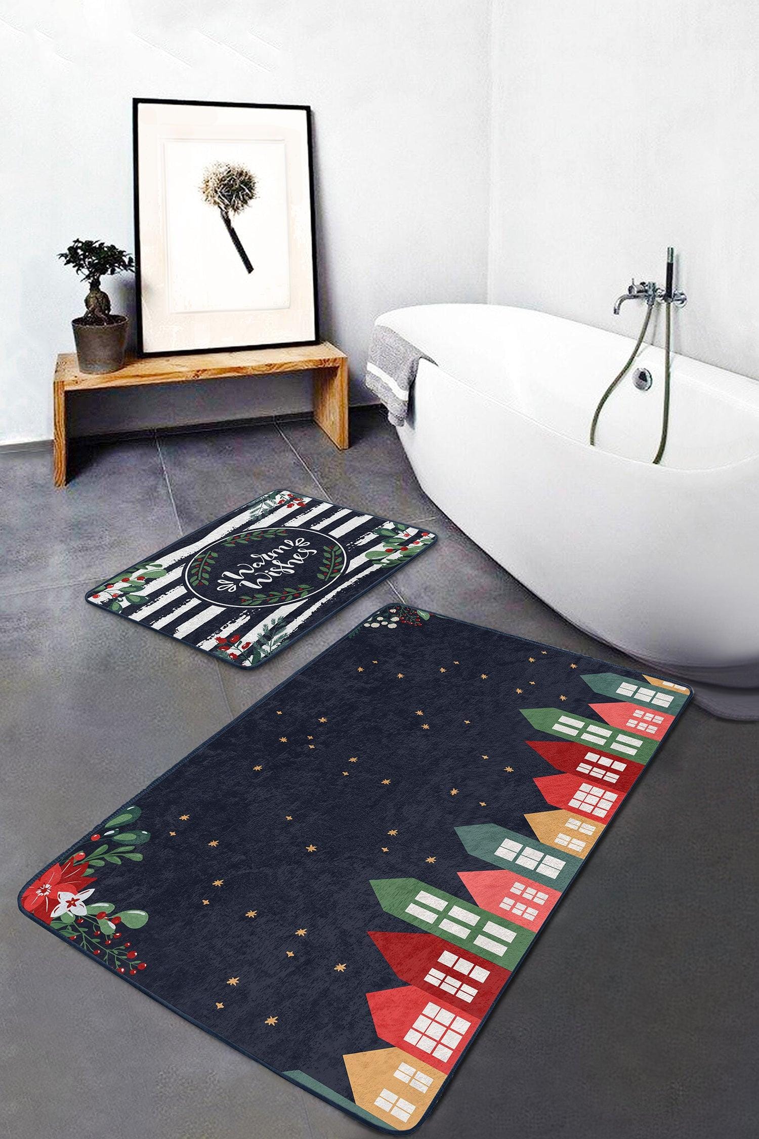 Lacivert Zeminli Renkli Evler Özel Tasarım 2li Banyo Paspas ve Halısı Takımı Kaymaz Taban Yıkanabilir
